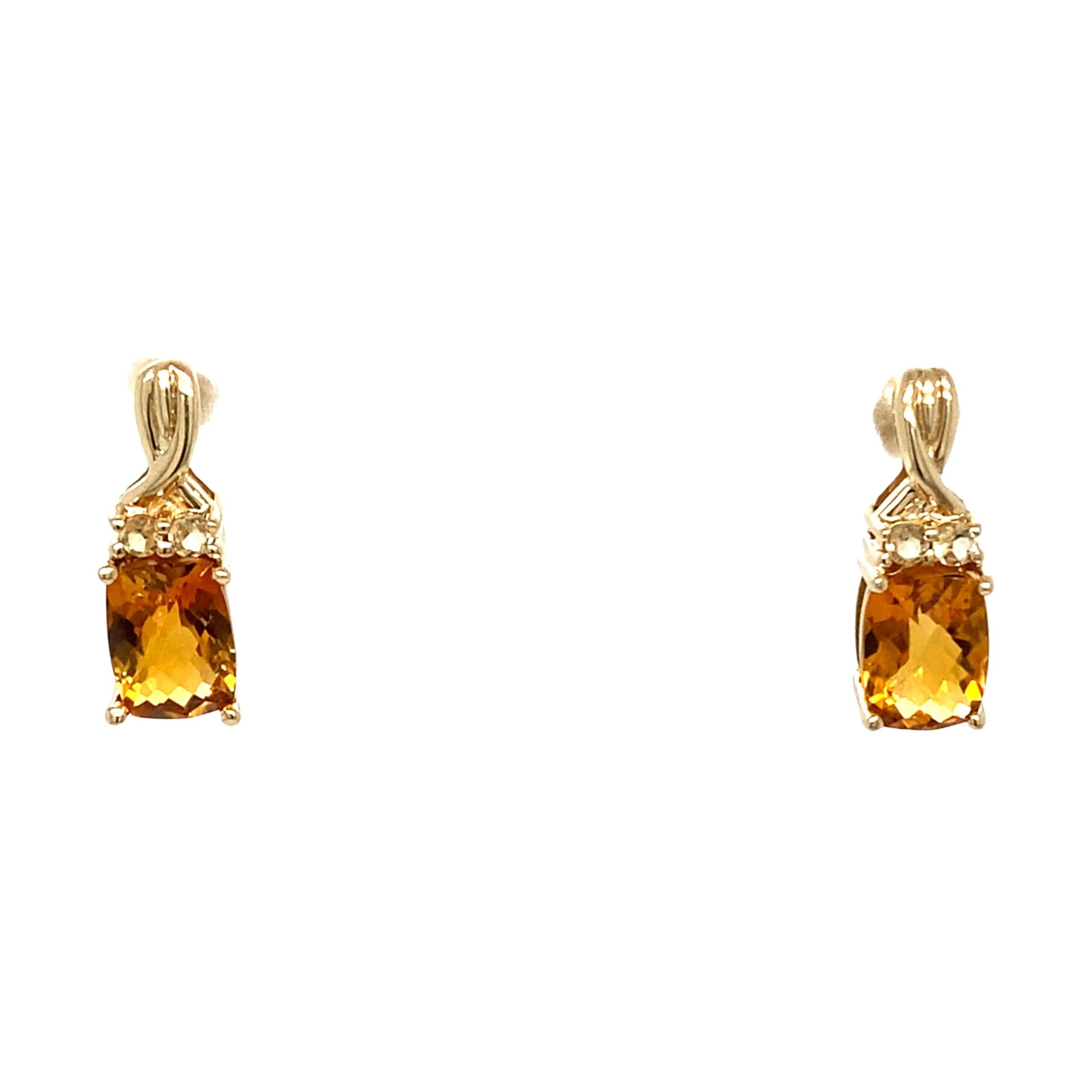 These earrings shine with bright yellow-orange citrine, checkerboard-cut for maximum sparkle. Tiny round yellow citrine stones accent their tops.
