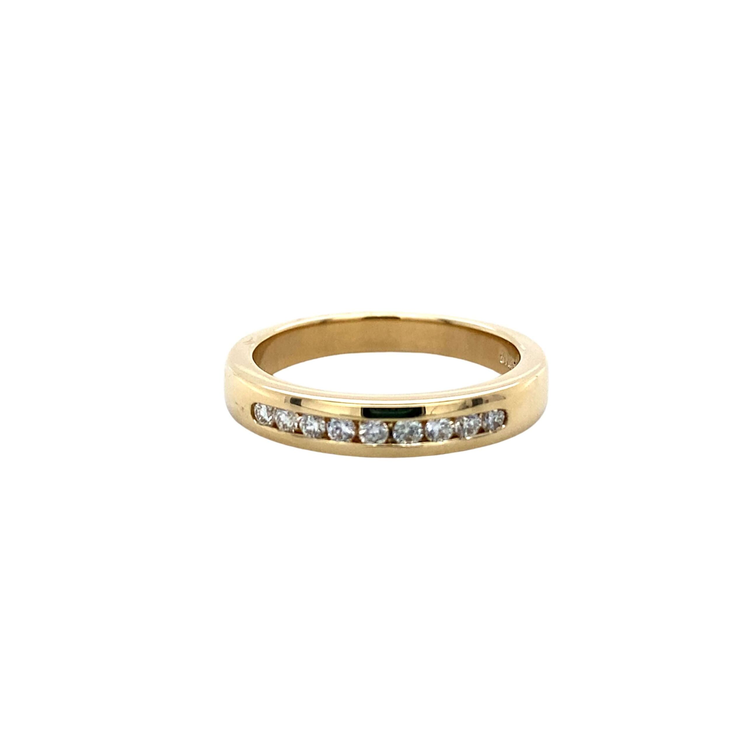 This classic band flashes beautiful round brilliant diamonds, lined by channels of shining gold. A timeless look, it can be worn on its own, as a wedding band, or with other stackable designs.
