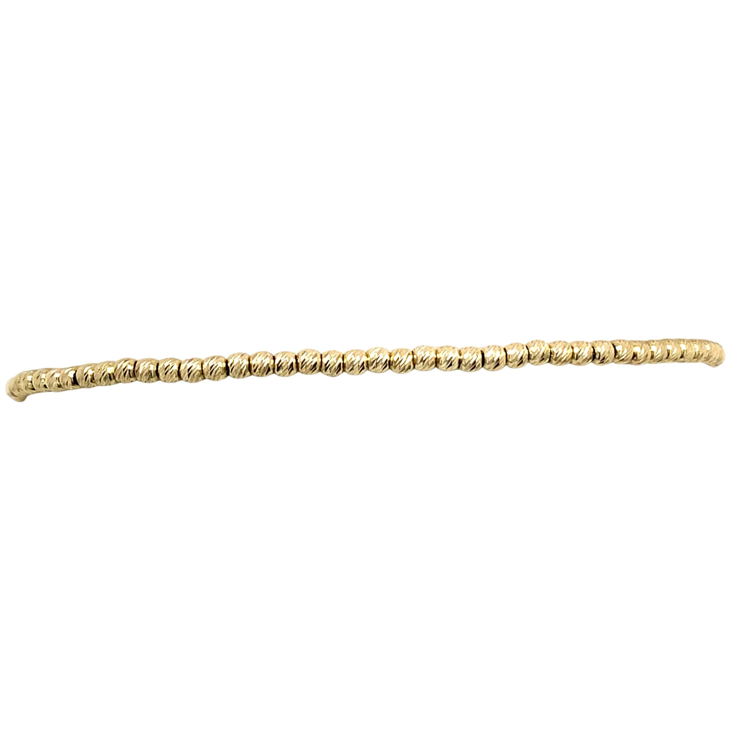 This timeless bracelet features glittering gold beads that sparkle beautifully in the light. It is a comfortable piece that can easily be layered with other bracelets or worn on its own for a classic look.