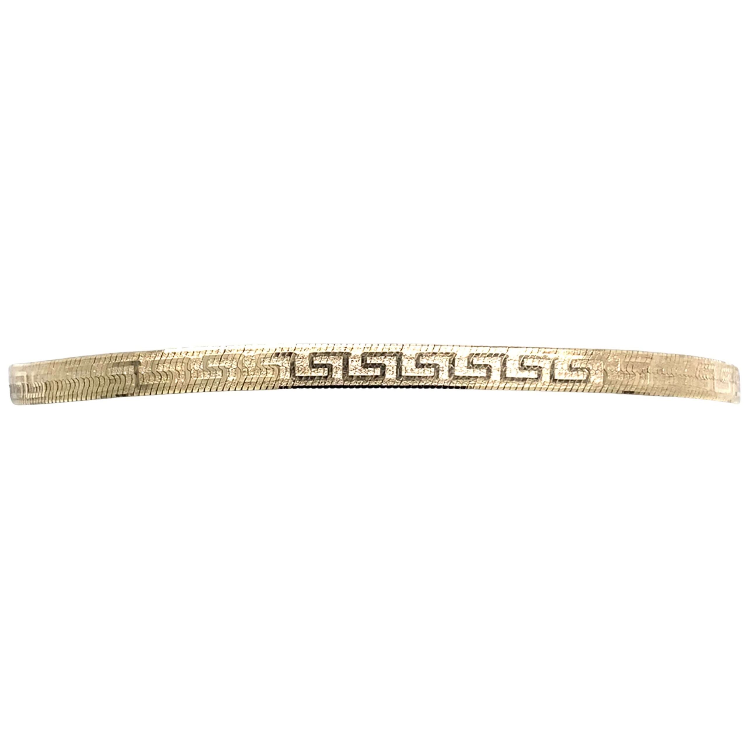 Classic and elegant, this herringbone bracelet is reversible, with one side the traditional herringbone style and the other displaying a Greek key pattern. Easy to wear and lightweight, it can be worn on its own or stacked with other bracelets.