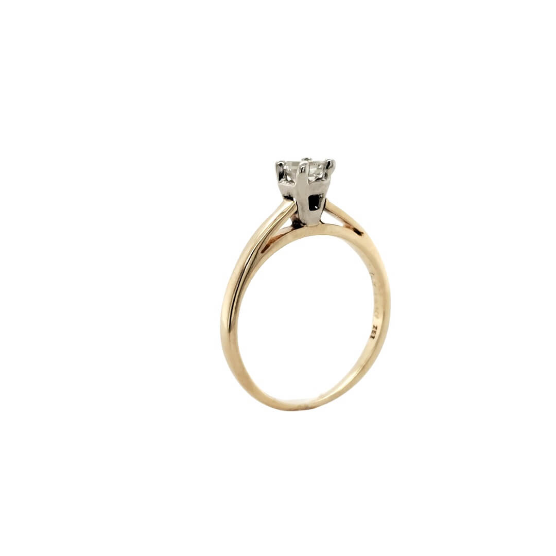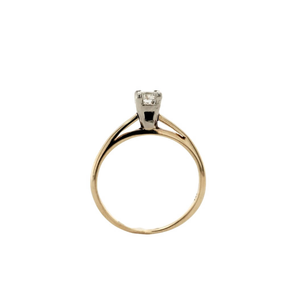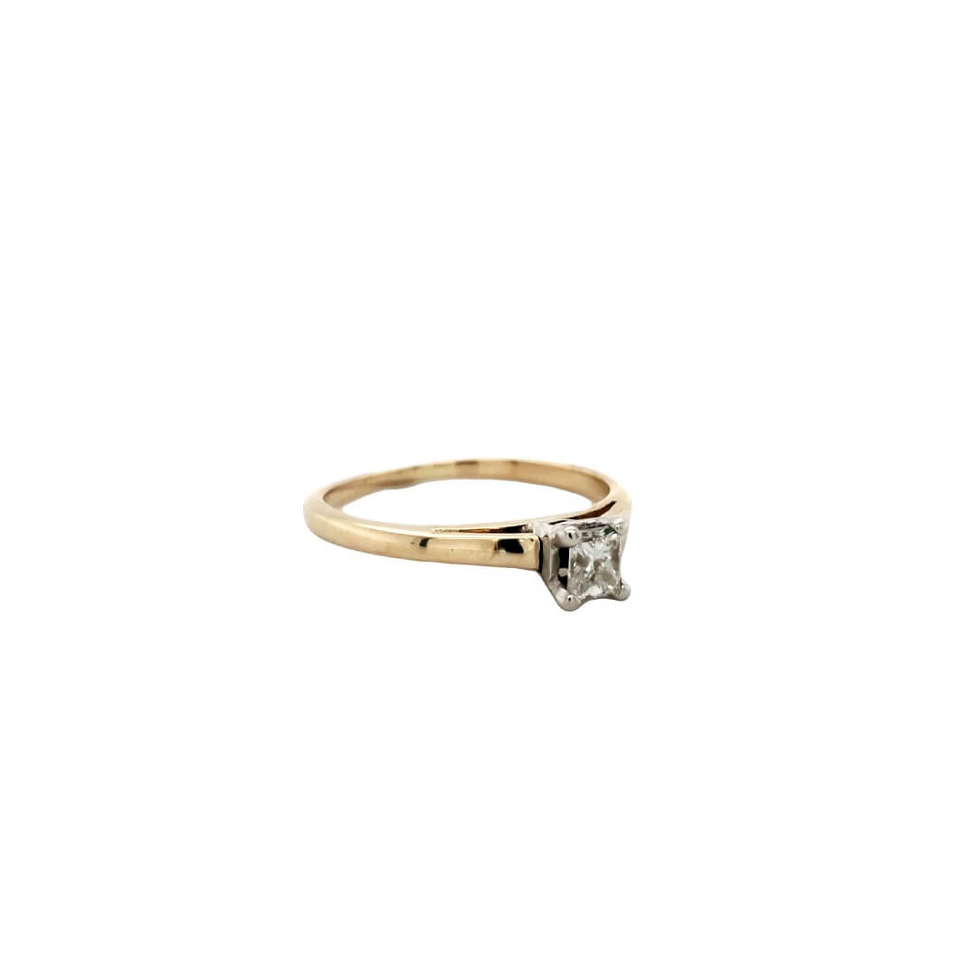 This classic solitaire boasts a princess-cut diamond with a cathedral setting. The ring sweeps up elegantly to meet the stone, which is set in a white gold head to preserve the color of the diamond, while the band is yellow gold to keep its classic look.