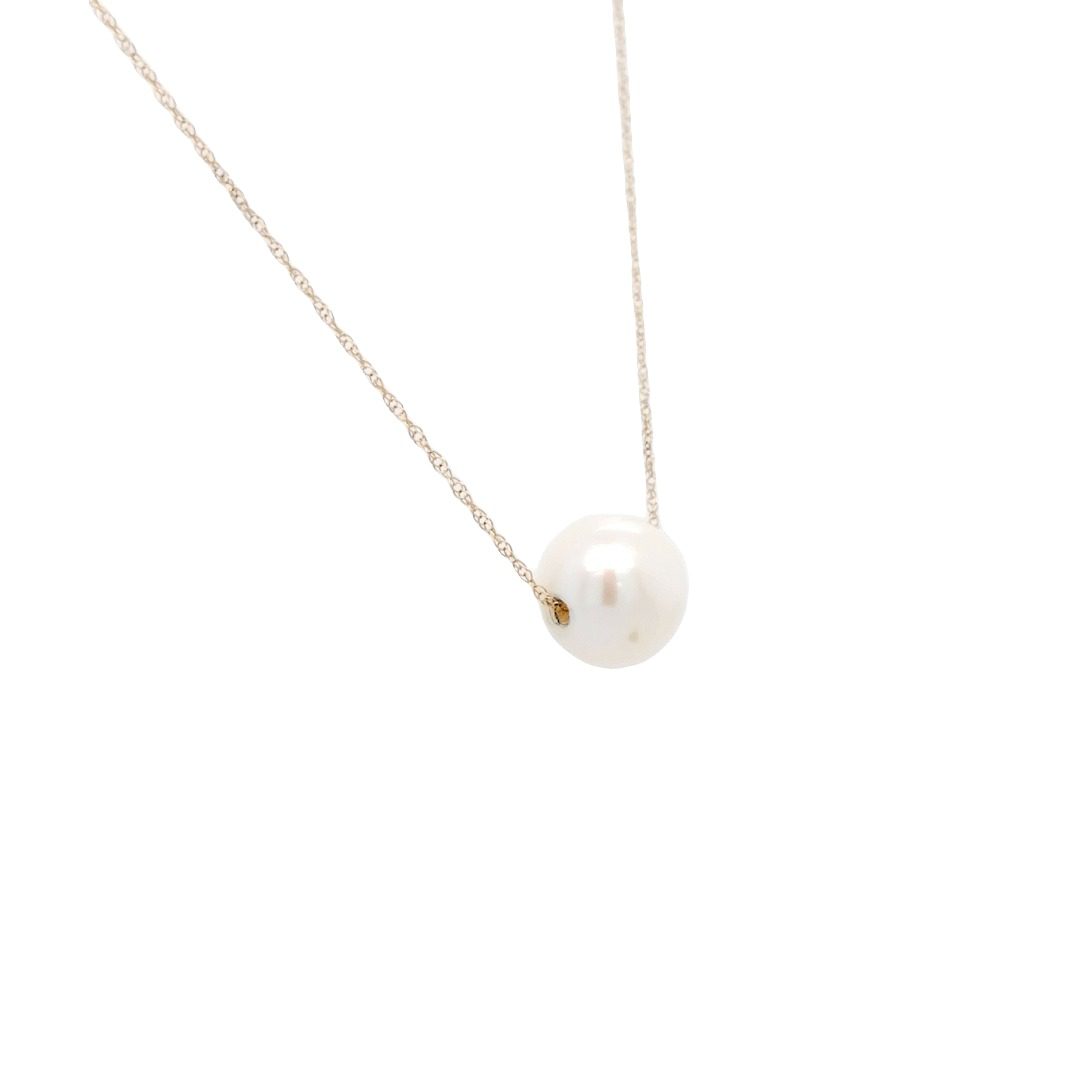 This elegant single pearl necklace features a 8-9 millimeter round pearl that sits on a 14 karat yellow gold chain. This necklace is a very simple and classic piece that can be worn with anything, whether you’re dressed up or dressed down. It is a timeless piece that will never go out of style.