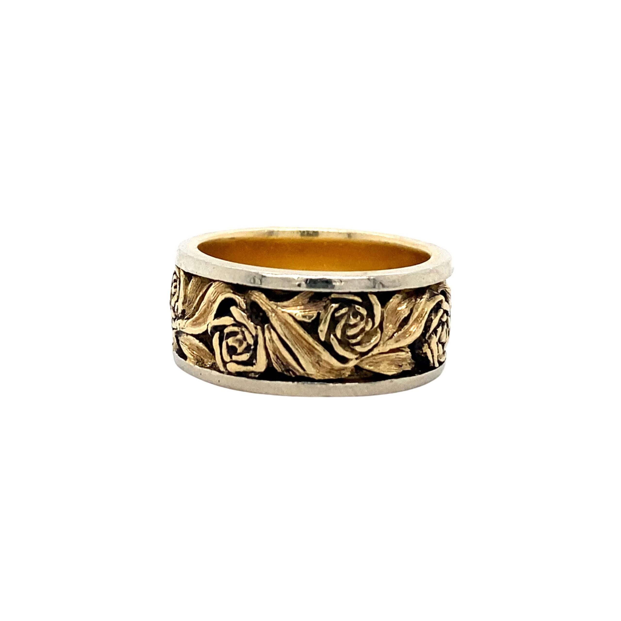 This elegant ring features beautifully carved yellow gold roses and leaves intertwined together and framed by white gold rims. The antiquing emphasizes the stunning and intricate detail.