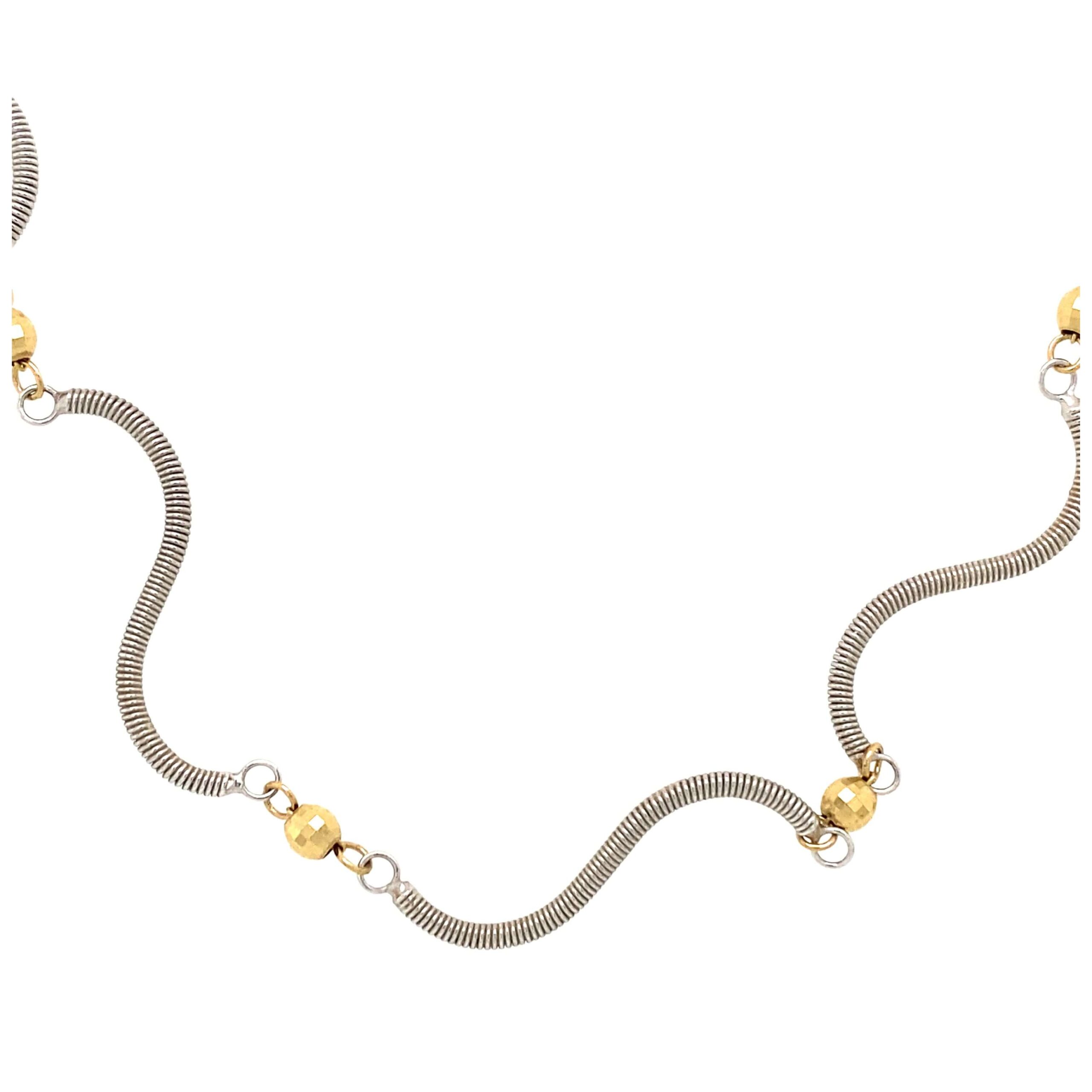 This beautiful necklace is fun and fashionable, alternating spiraling links of white gold with patterned yellow gold beads. Modern and artistic, this piece can be worn on its own or layered with other necklaces.