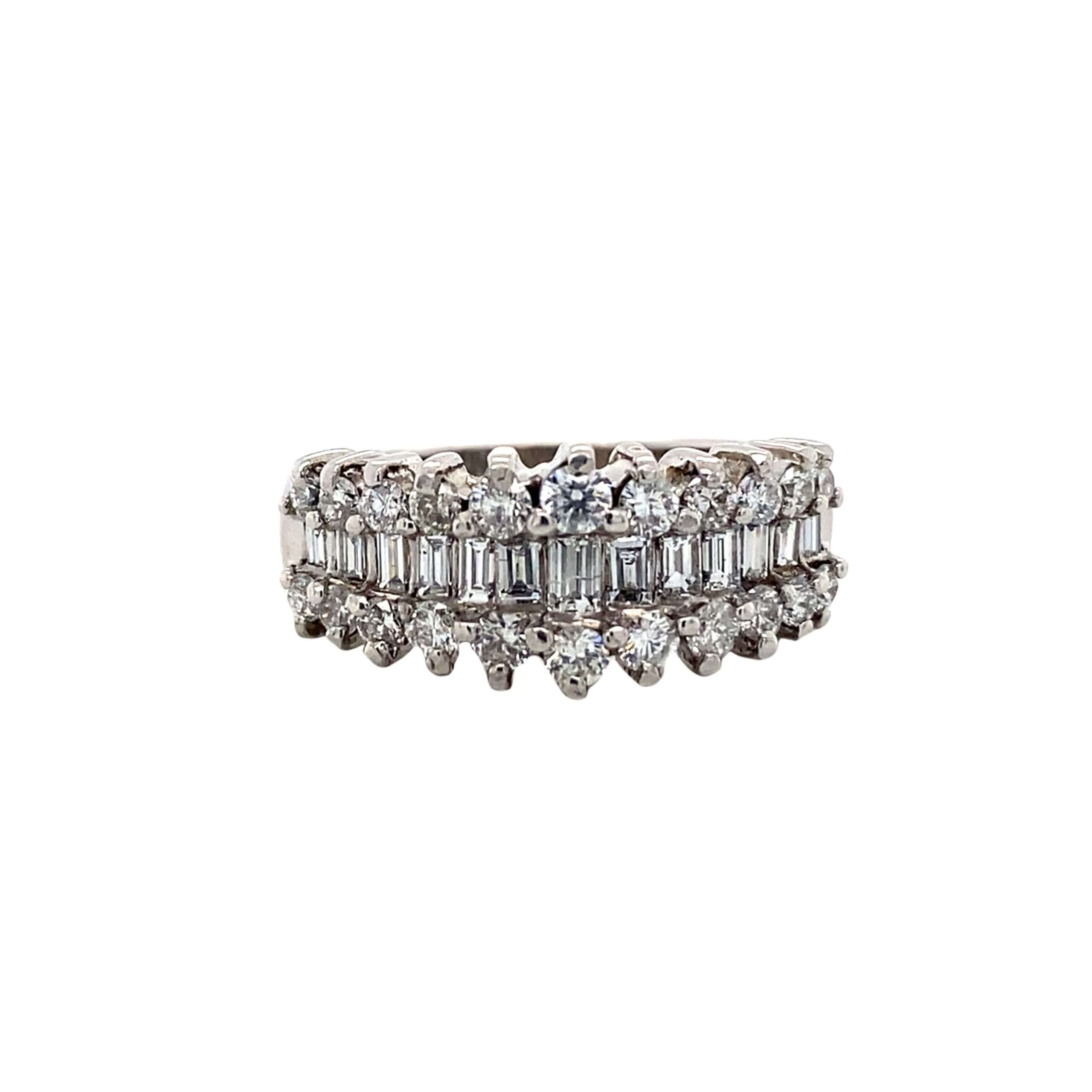 This stunning statement piece frames baguette diamonds with round brilliant diamonds set in a scalloped design. Bright and beautiful, this ring glitters from across the room and catches every eye.