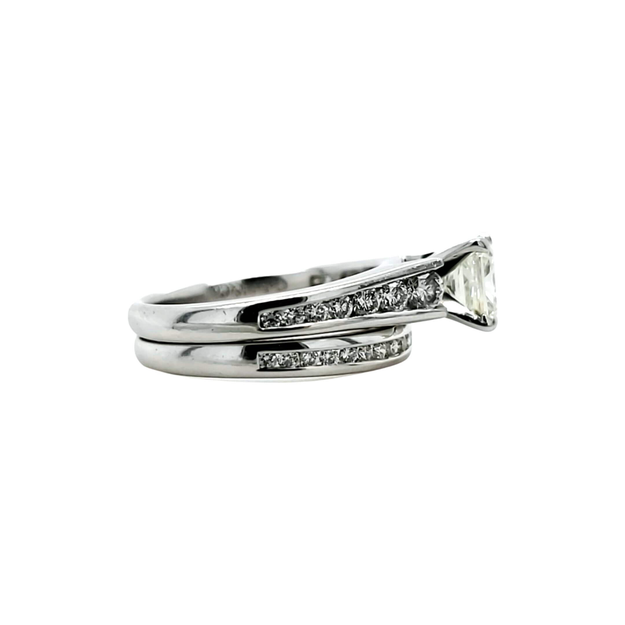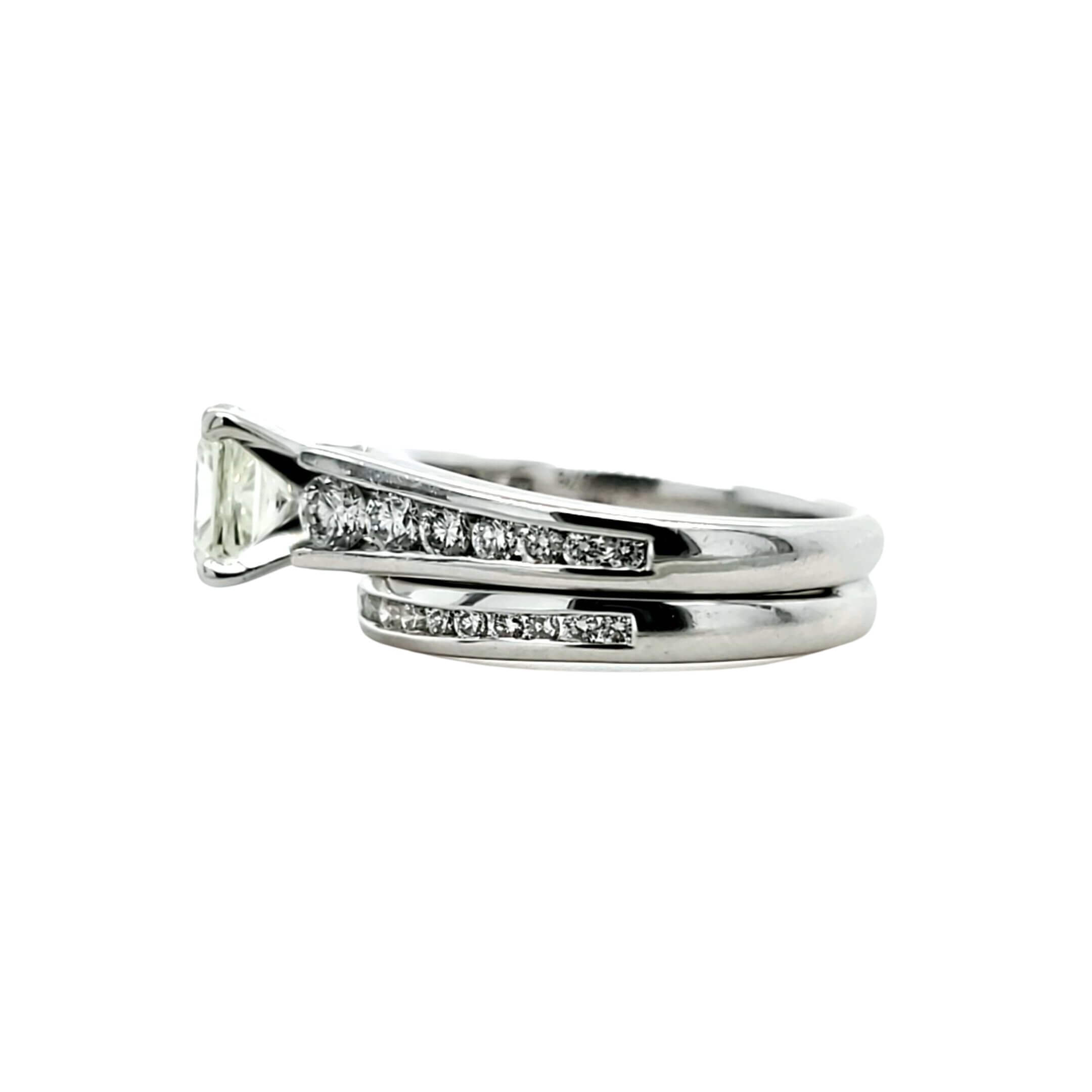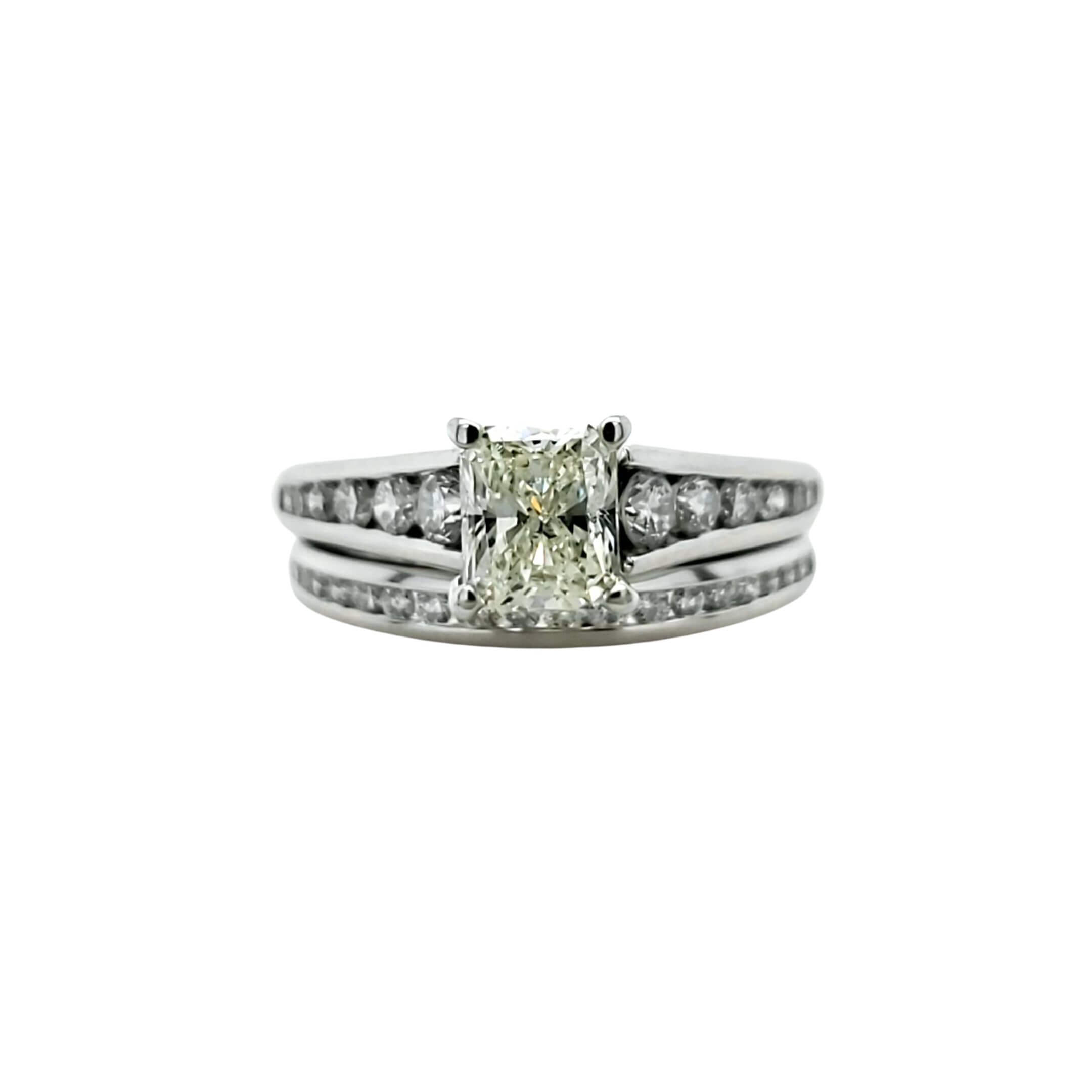 This stunning wedding set features a 1.01 carat radiant diamond framed by round brilliant diamonds in the engagement ring and soldered wedding band. This ring is classic and sparkles vibrantly, the perfect piece for a jewelry lover.