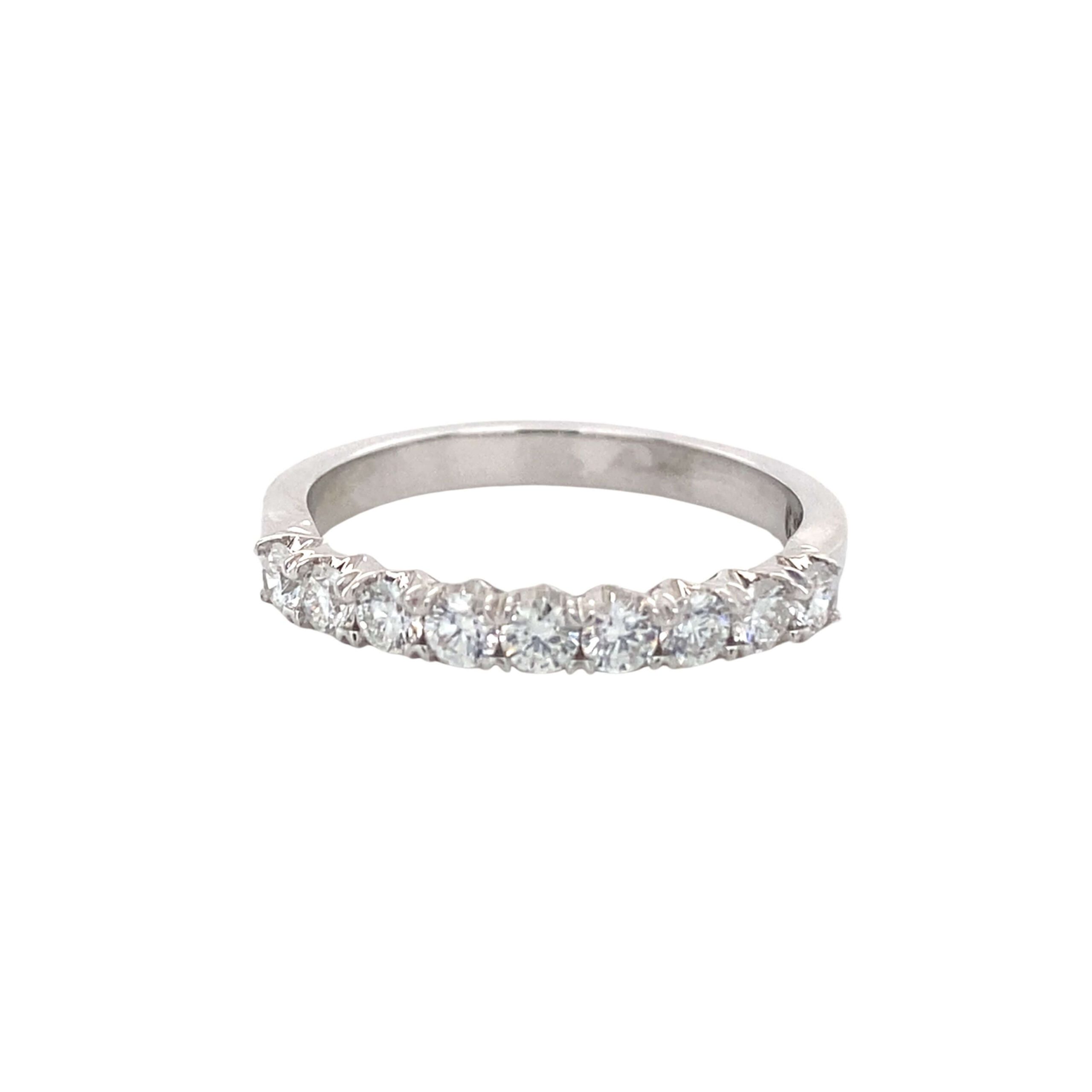 This stunning band shows off glittering diamonds in a classic prong-set design. Whether set beside other stackables, with an engagement ring, or worn on its own, it is a beautiful piece that will always be in style.