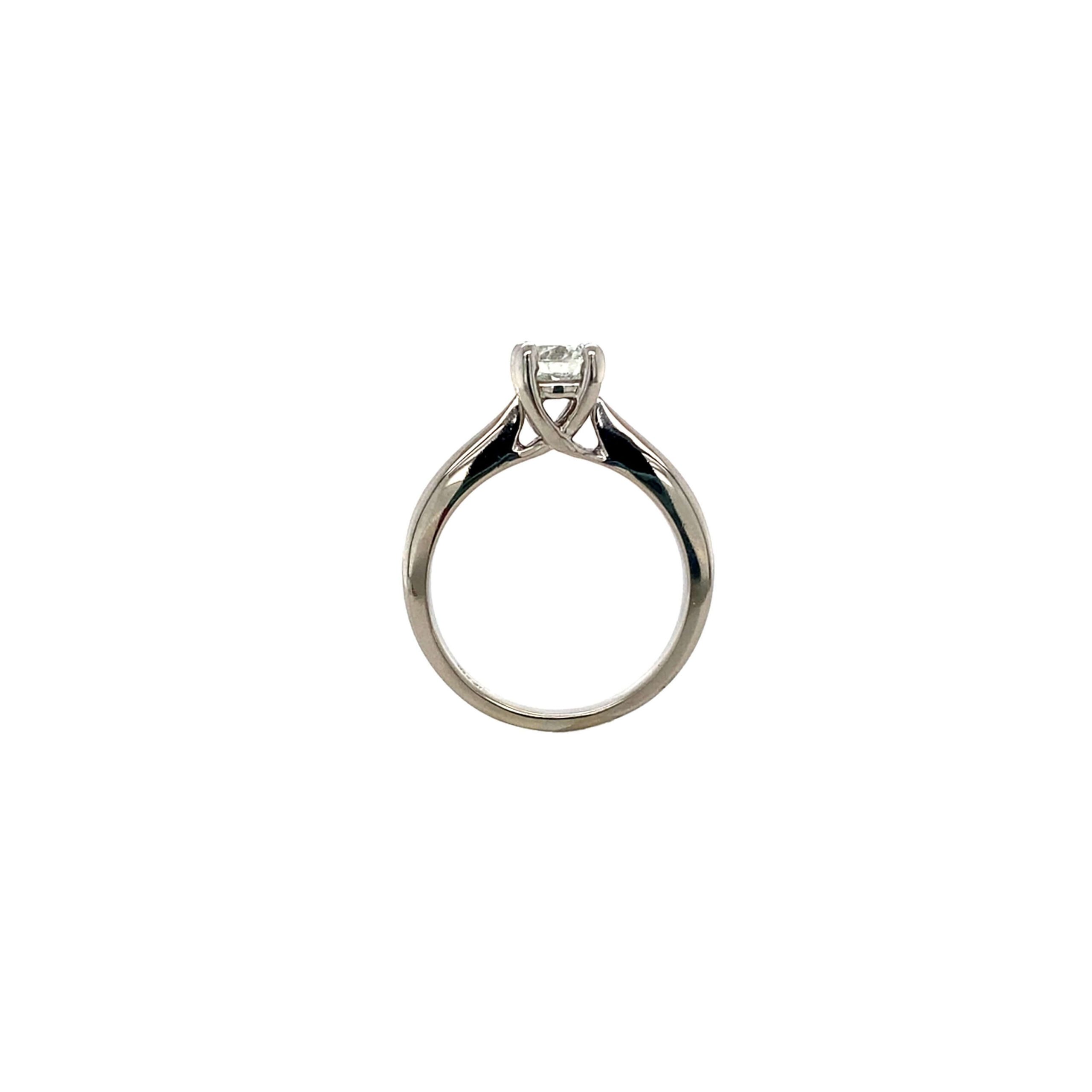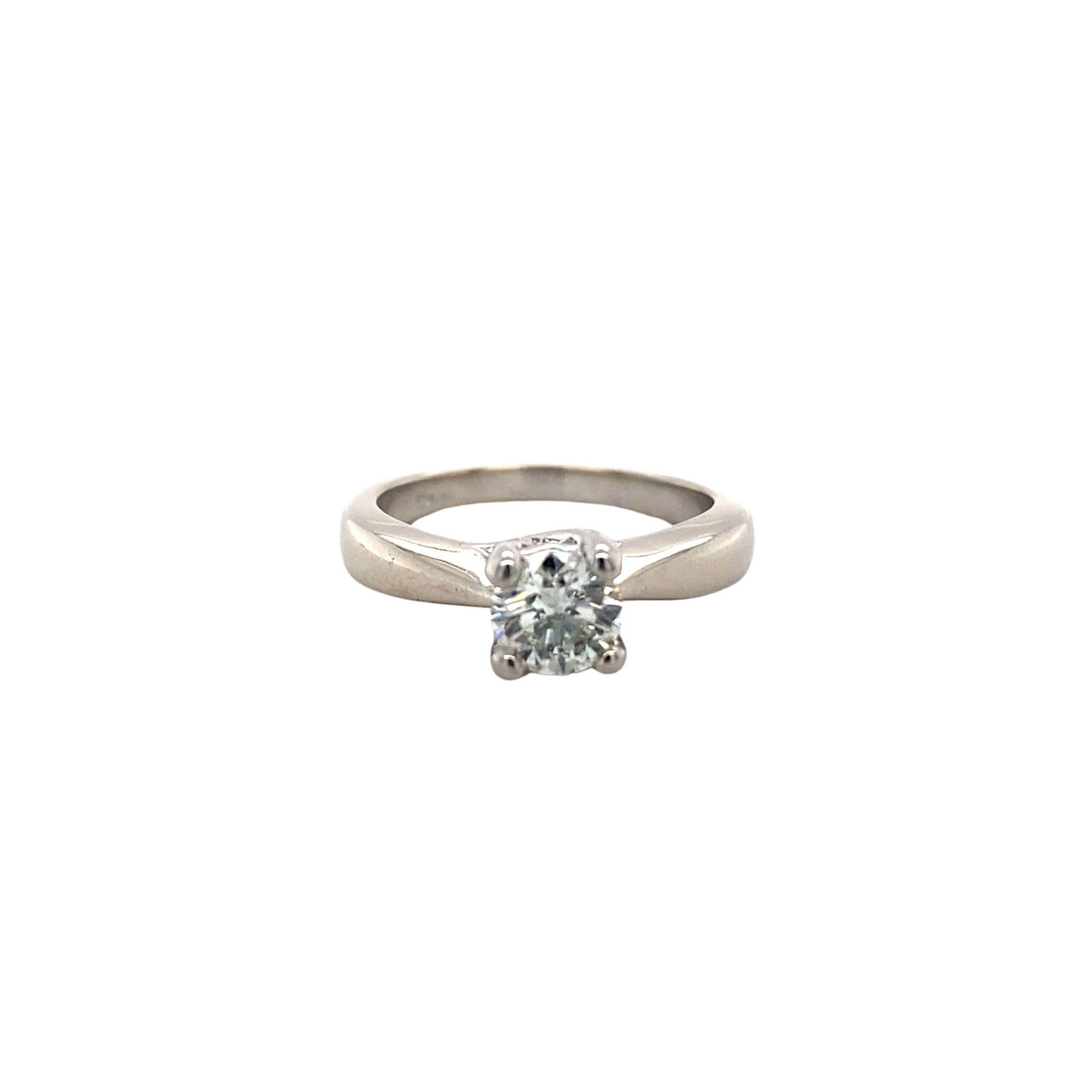 This timeless design shows off a sparkling round brilliant diamond in a classic four-prong setting. The wide shank ensures security but tapers in at the stone to show off its beautiful shine.