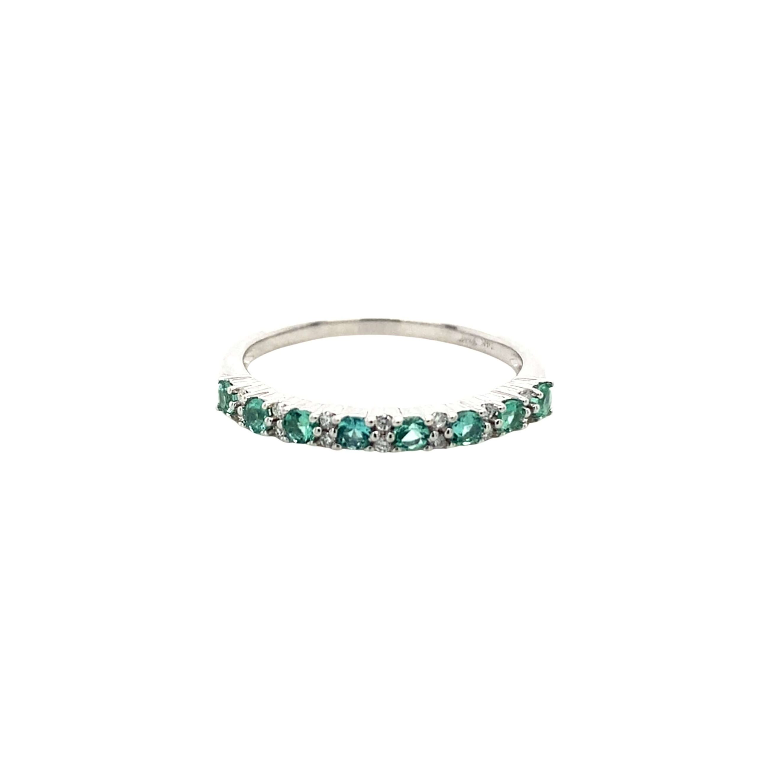 This beautiful band alternates stunning green emeralds with glittering diamonds in a textured and modern design. This piece can be worn as a birthstone piece for May, with other stackable pieces, or on its own as a bright spot of color.