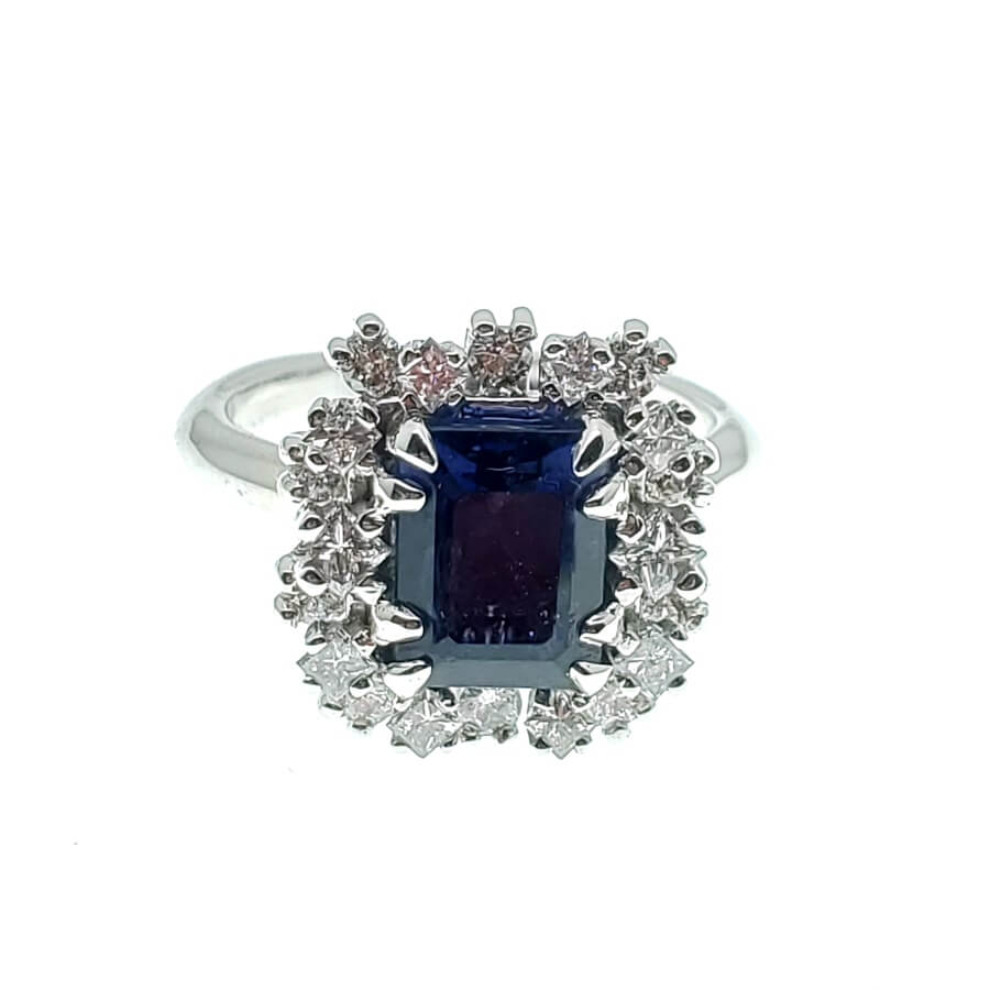 This amazing iolite is a rich, deep blue, cut as an emerald-cut for a mirrored effect that is absolutely gorgeous. A layered halo of alternating princess-cut and round brilliant diamonds completes it to stunning perfection.