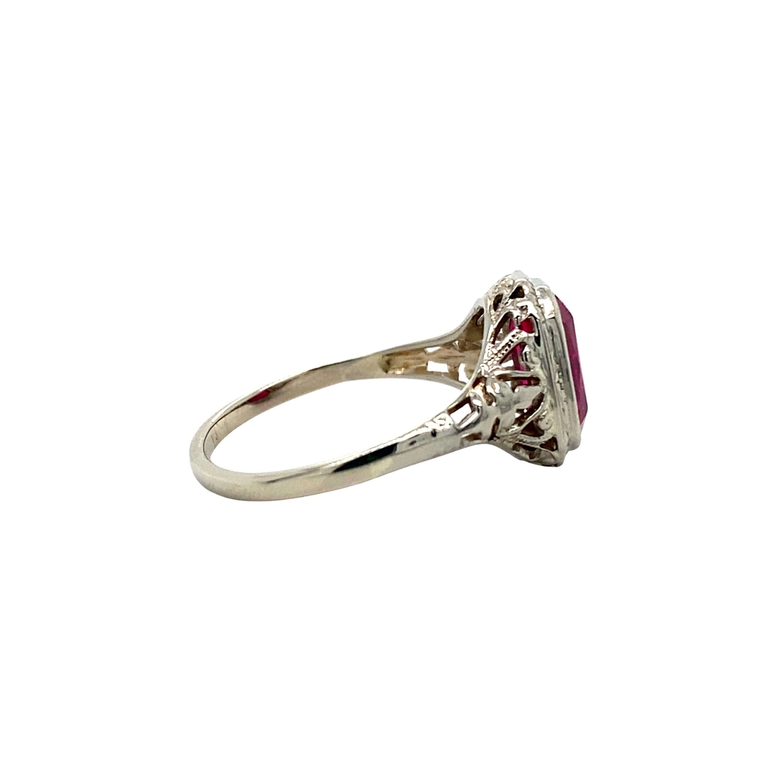 The beautiful vintage styling of this ring makes it sure to grab the eye. The filigree design is elegant and detailed, framing an emerald-cut red stone for a low-profile and stunning look.