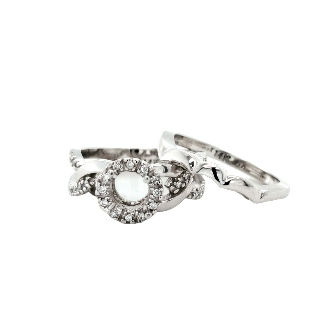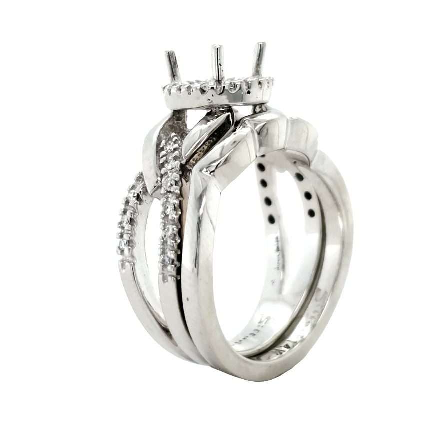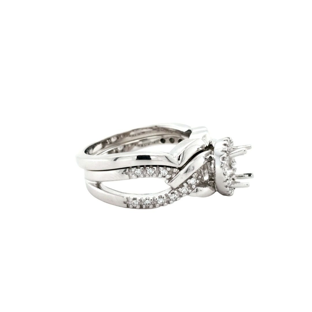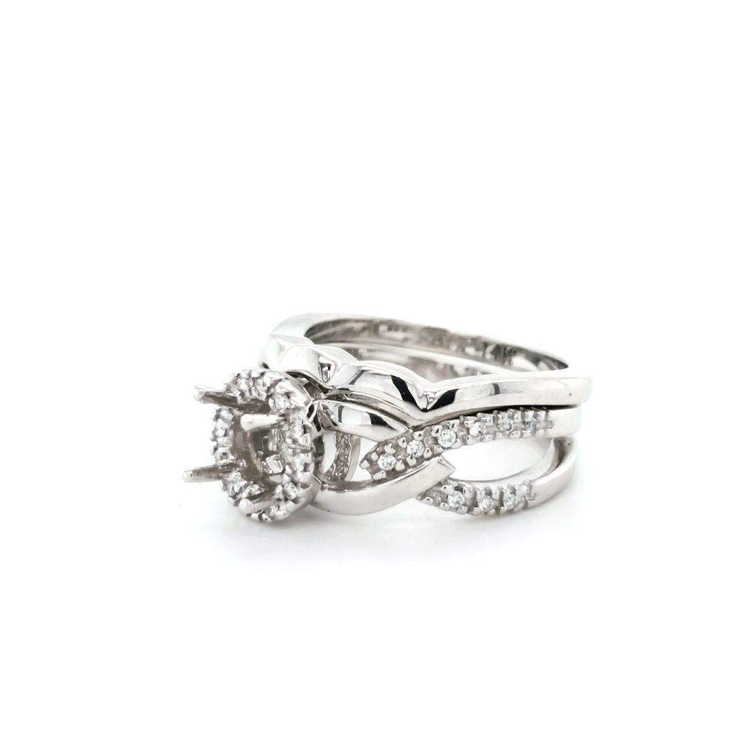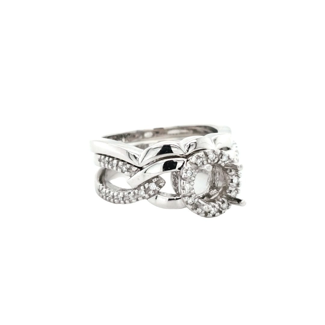This perfectly matched set features an elegant interlocking design on the engagement ring that intertwines polished gold with round brilliant diamonds. The halo completes the look along with a highly polished curved wedding band that fits flush with the engagement ring.