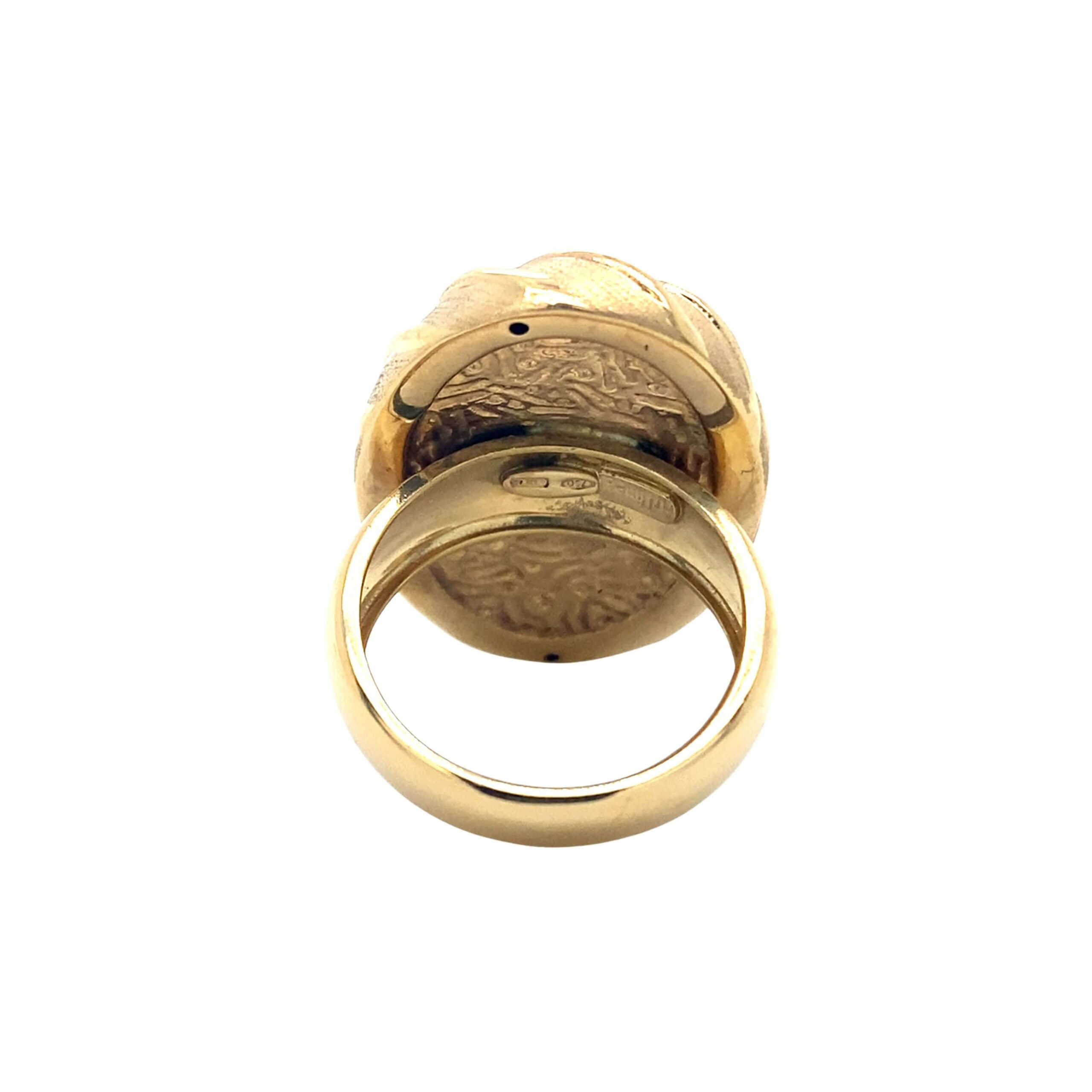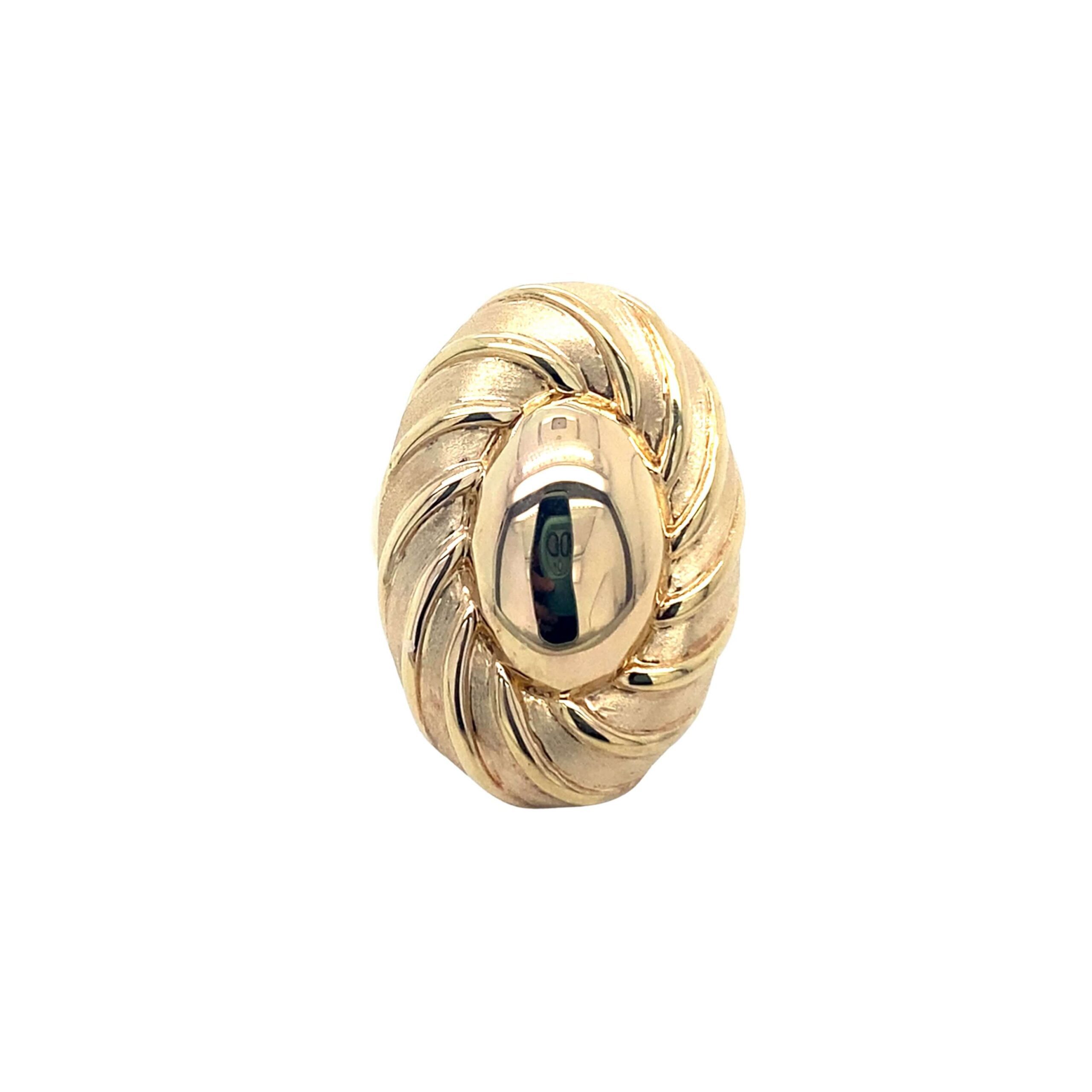 This statement-piece ring is both fun and fashionable, and it will catch every eye in the room. The center dome is polished gold, and the satin finish on the detailed outline adds to the stunning texture and character of the piece.