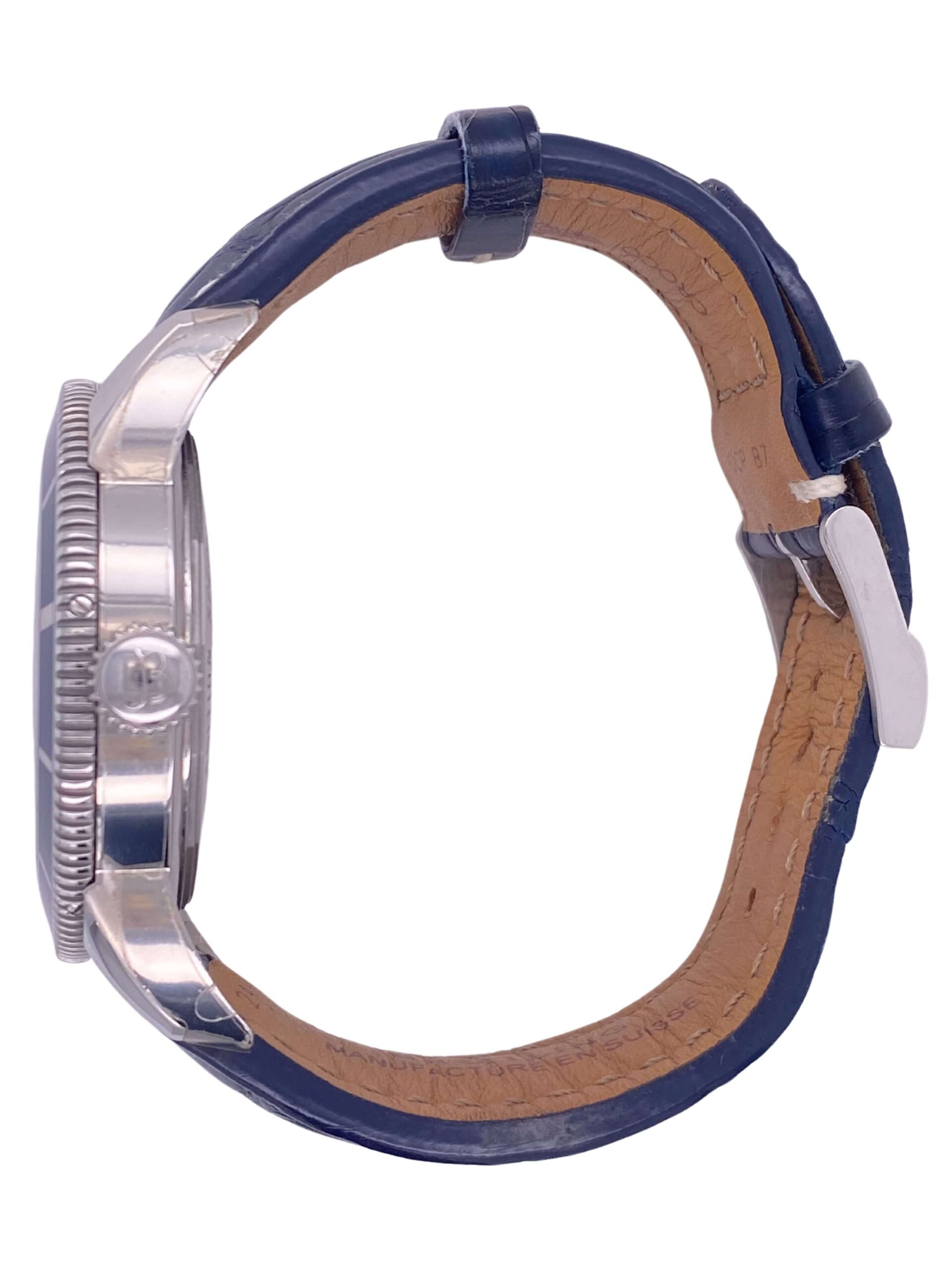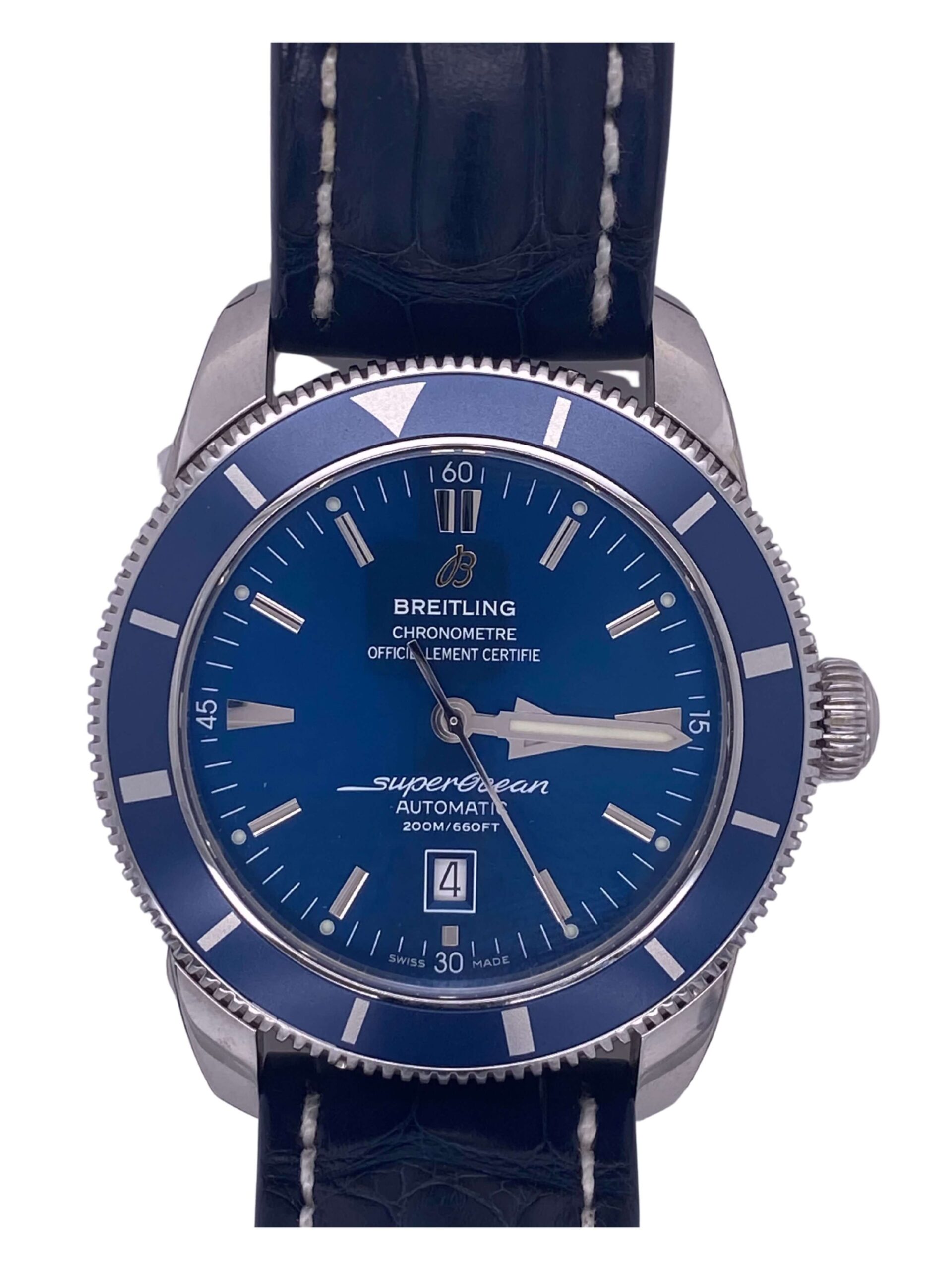 This pre-owned Breitling Superocean Heritage watch shows off a classic modern design with a unidirectional rotating bezel, blue face, and luminous hands, making it an excellent addition to any collection. This watch comes with an inner and outer box as well as the original warranty card and instruction manual. There are minor scratches on the case and band. Please see pictures for reference. The internal workings are fully functioning. Please call the store at 616-534-7039 for purchasing information.