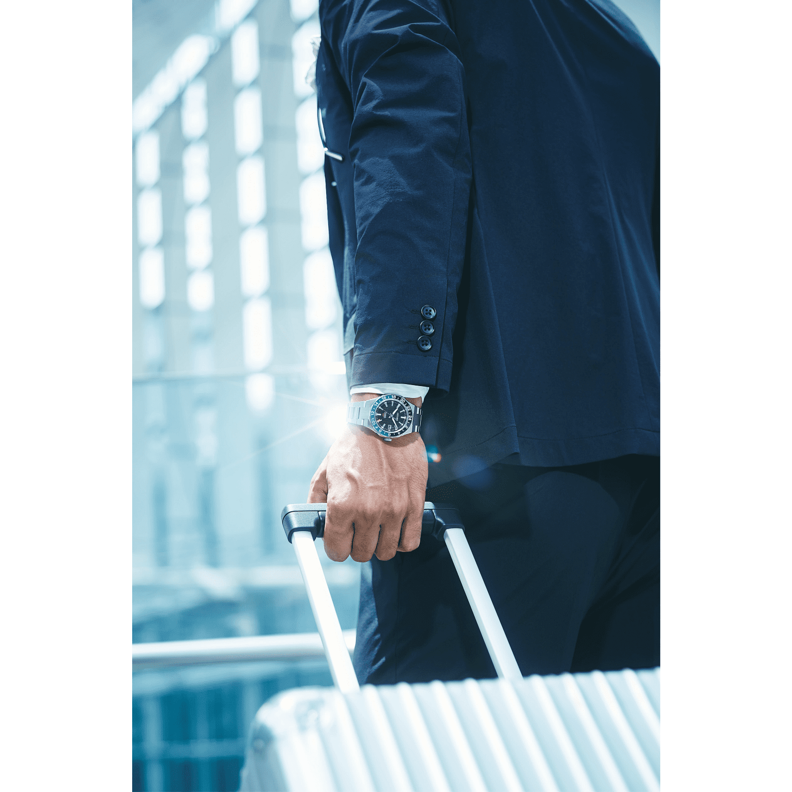 Functional and practical, modern and sporty – the new Citizen Series 8 GMT is the perfect companion from daily wear to spirited travel andeverything in-between. The reimagined Citizen Series 8 collection of mechanical watches features elevated designs and high-performance automatic movements with enhanced magnetic resistance to fit every occasion, and this new traveler GMT watch is an impressive addition. Featuring an hour hand which can be independently set, the four-piece case construction defines the design of the brushed and polished silver-tone stainless steel 41mm case that frames the look, with an integrated three-link stainless steel bracelet securing the watch to the wrist and adding a modern sportiness in its wear. A black and blue bi-directional bezel centers the textured black dial with its two-tone 24-hour GMT scale, clicking precisely on each rotation, where a framed date display at the 3 o’clock position provides daily utility, while an orange-tipped hand assists in keeping track of multiple time zones. Water resistant up to 100 metres. Calibre 9054.