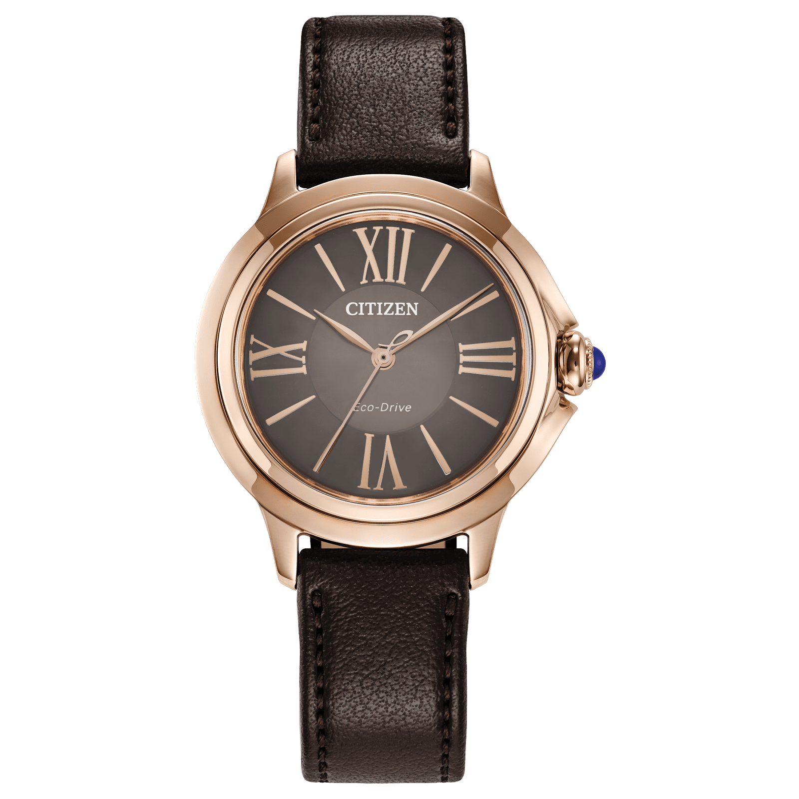When it comes to elegant watches for women, the Ceci is the ultimate addition to a collection. Featuring a silver-tone and pink gold-tone stainless steel case measuring 32mm across, its distinct shape is punctuated by a synthetic sapphire-set crown. On the dial, a rich brown display is host to more rose gold-tone accents, with the slim lines of the Roman numeral indices matching those of the hands. With this watch, you’ll never need to worry about replacing a battery — this watch is sustainably powered by any light with our proprietary Citizen Eco-Drive technology. Whether you’re looking for a dress watch for special events or a beautiful timepiece to wear every day, the Ceci will look great on every wrist and at every occasion. Caliber E031.