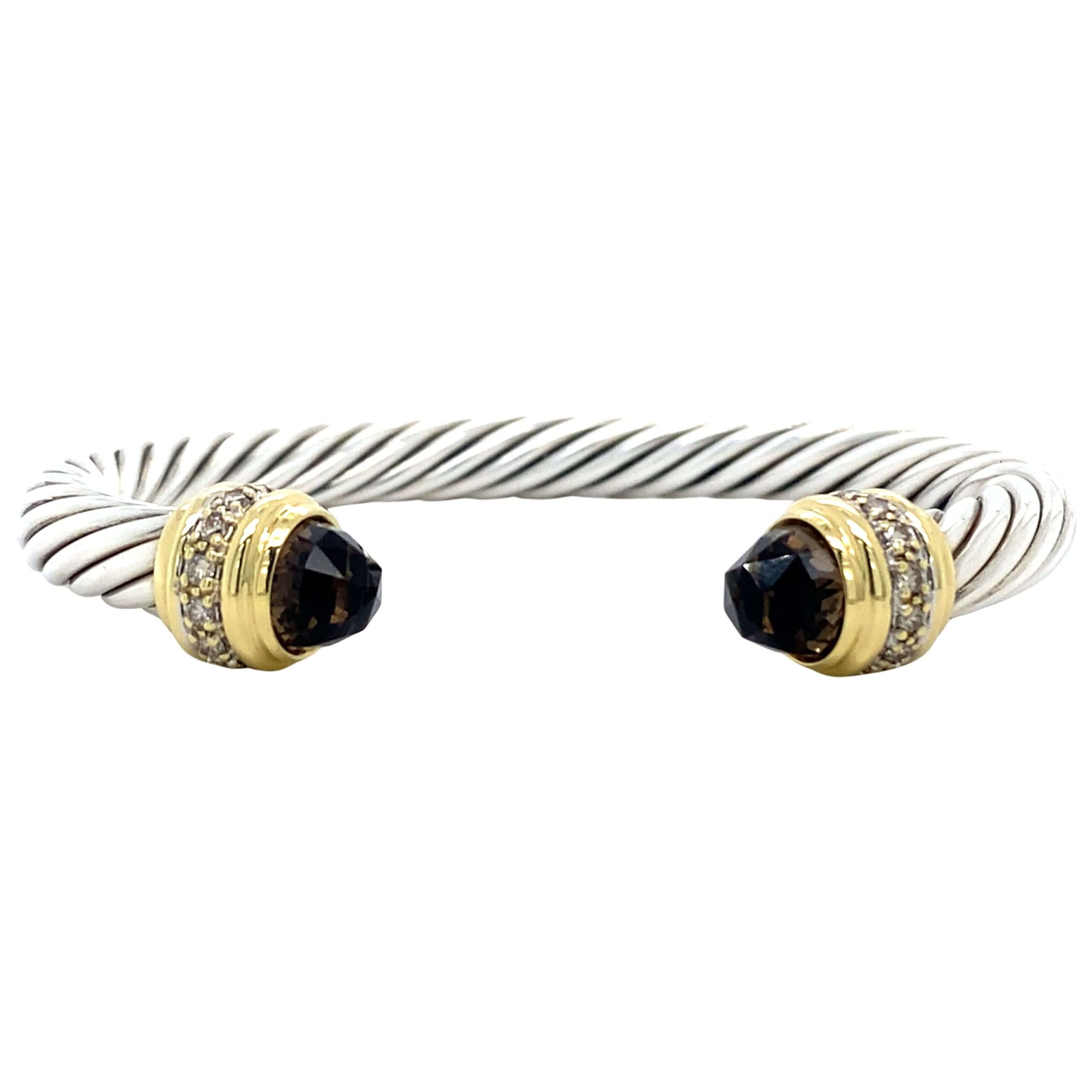 This pre-owned David Yurman bangle is striking with its modern twisted style and yellow gold accents, eye-catching and comfortable to wear. The ends are crowned with faceted smoky quartz to complete the look. The box and paperwork are not included.