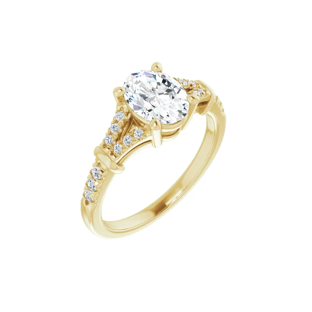 The split band on this ring combines together in an elegant gold bar before continuing with diamonds, making it a stand-out engagement ring. Center stone sold separately. Pricing for customized pieces is variable depending on each person’s design. Please contact us at the store for more information.