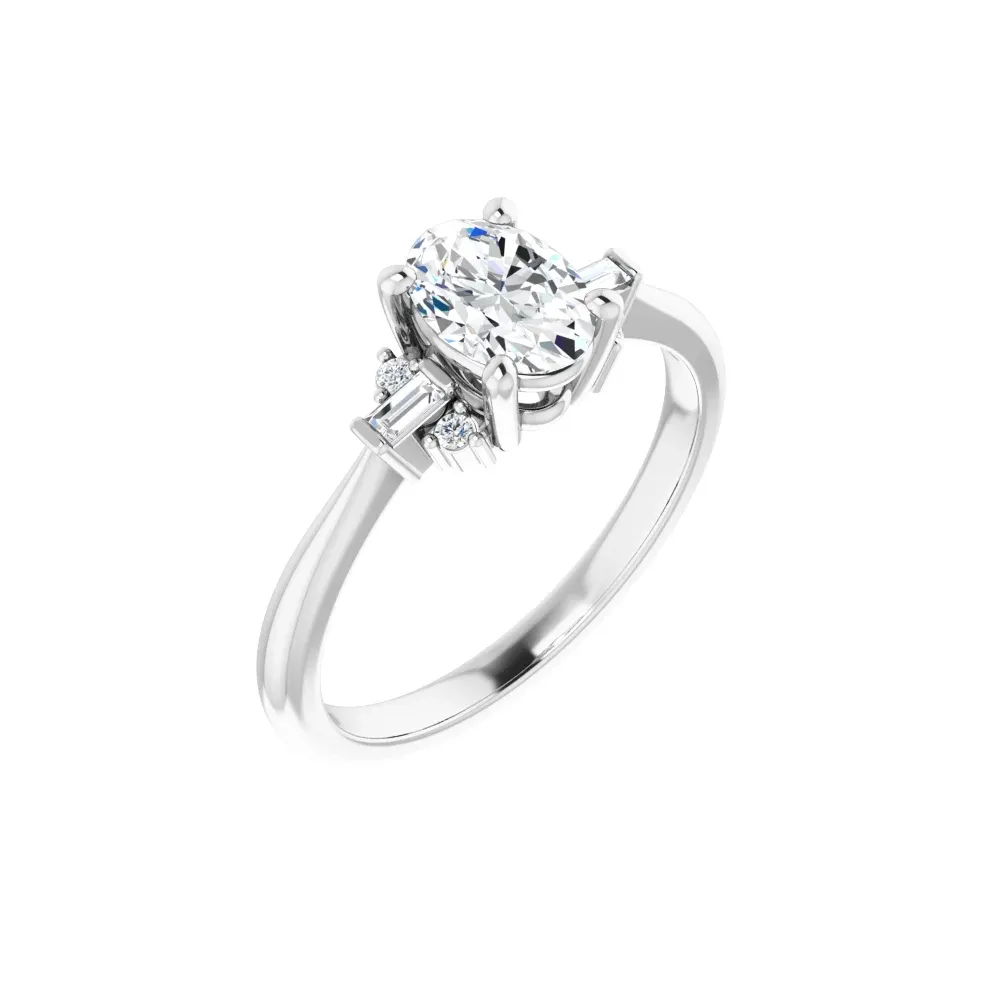 The geometric design of this ring shows off shining baguettes bracketed by round brilliant diamonds, one cluster each on either side of the center stone. Center stone sold separately. Pricing for customized pieces is variable depending on each person’s design. Please contact us at the store for more information.