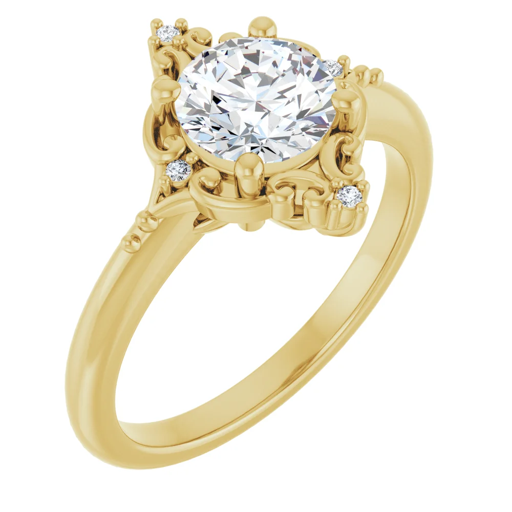 Intricately carved swirls and dips of gold accented with diamonds make this ring both understated and elegant. Center stone sold separately. Pricing for customized pieces is variable depending on each person’s design. Please contact us at the store for more information.