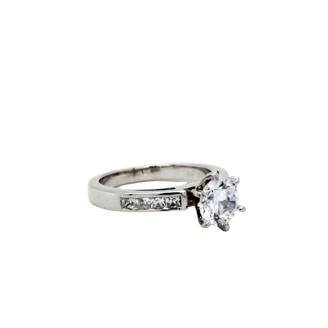 Featuring channel-set princess-cut diamonds along the band, this beautiful engagement ring also uses six prongs for the center stone to make sure your diamonds are secure. Timeless and traditional, this piece will never go out of style. This ring is made to order in any color of gold in any size, and the center stone is sold separately.