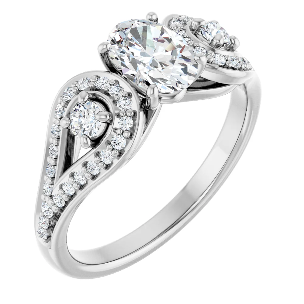 Artistic and elegant, this ring flashes round brilliant accent diamonds that curl in a looping design around two larger stones, all of which frame the stunning centerpiece. Center stone sold separately. Pricing for customized pieces is variable depending on each person’s design. Please contact us at the store for more information.
