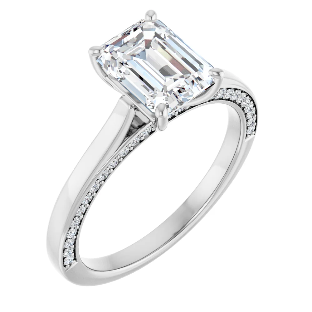 With diamonds set evenly in a row along the sides of the ring instead of the center, this ring adds detail and sparkle without detracting from the center stone. Center stone sold separately. Pricing for customized pieces is variable depending on each person’s design. Please contact us at the store for more information.
