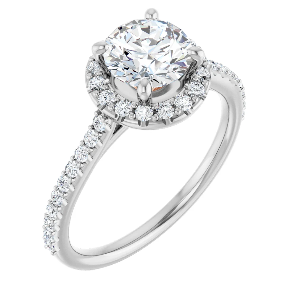 This stylish design is complemented by the infinity detailing added just below the center stone, as a reminder of the timelessness of an engagement ring’s promise. Center stone sold separately. Pricing for customized pieces is variable depending on each person’s design. Please contact us at the store for more information.