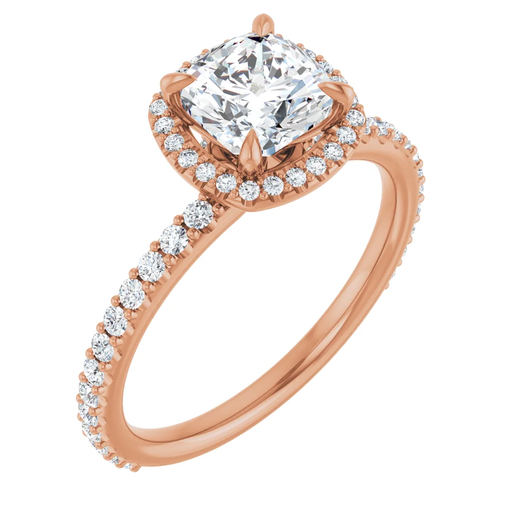This ring combines the best of both worlds with a subtle hidden halo and a traditional halo wrapped around the center stone. Center stone sold separately. Pricing for customized pieces is variable depending on each person’s design. Please contact us at the store for more information.