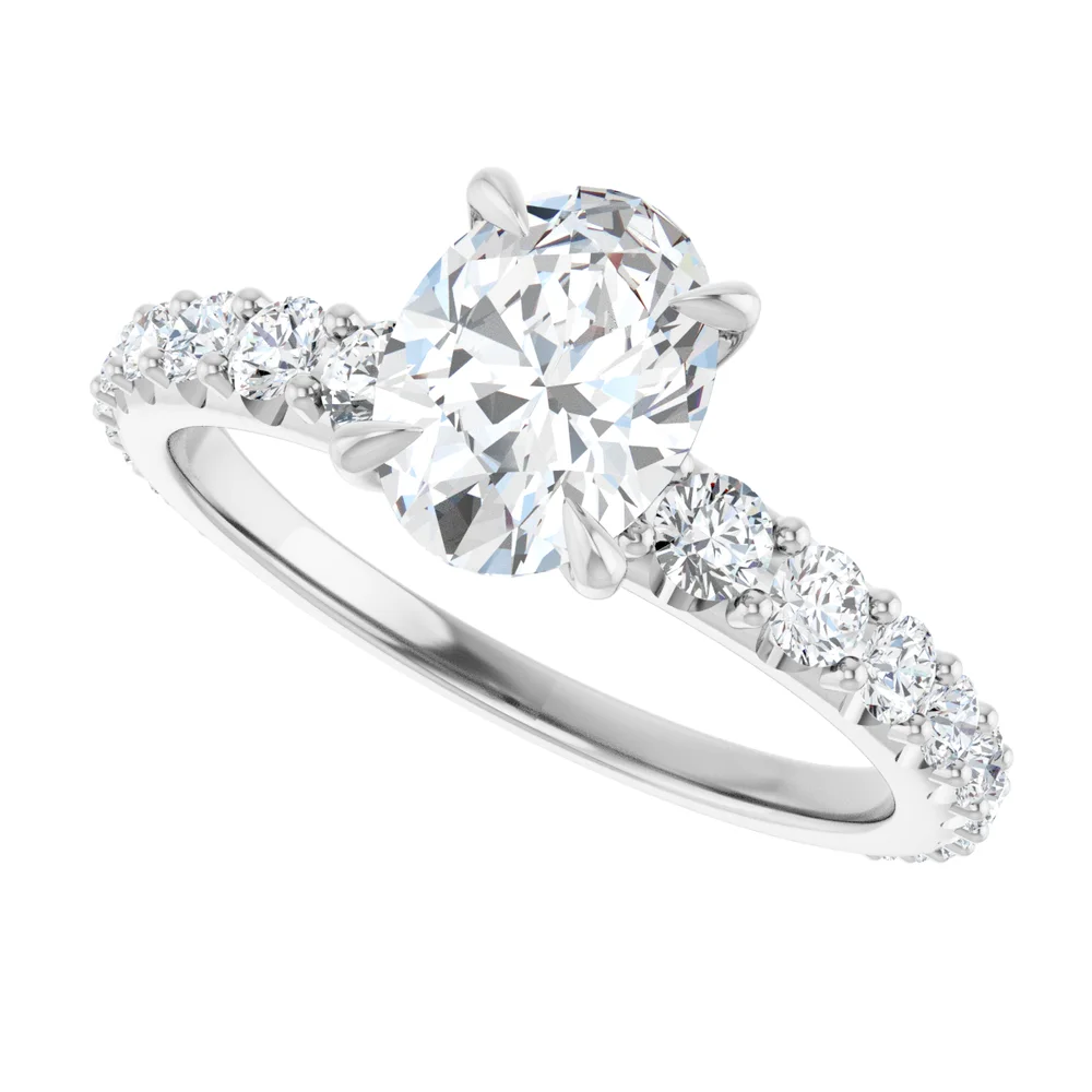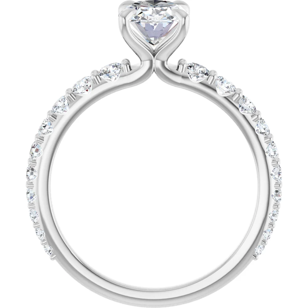 This beautiful ring features diamonds that build in size, finally reaching a crescendo with the center stone. Center stone sold separately. Pricing for customized pieces is variable depending on each person’s design. Please contact us at the store for more information.