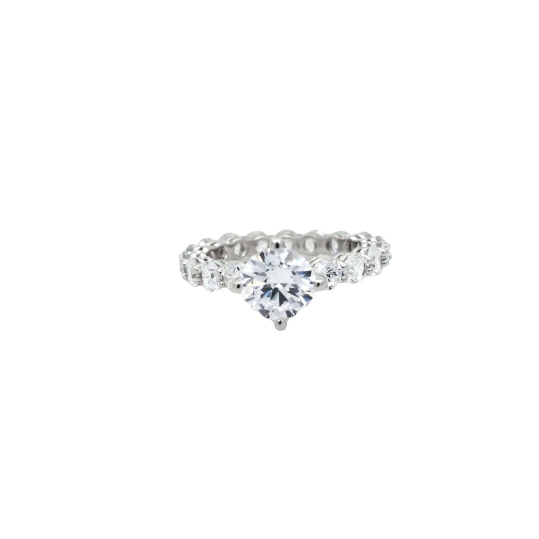 This stunning engagement ring features an eternity band with diamonds surrounding the entirety of the ring. With sparkle from every angle, this is a diamond lover’s dream come true. This ring is made to order in any color of gold in any size, and the center stone is sold separately.