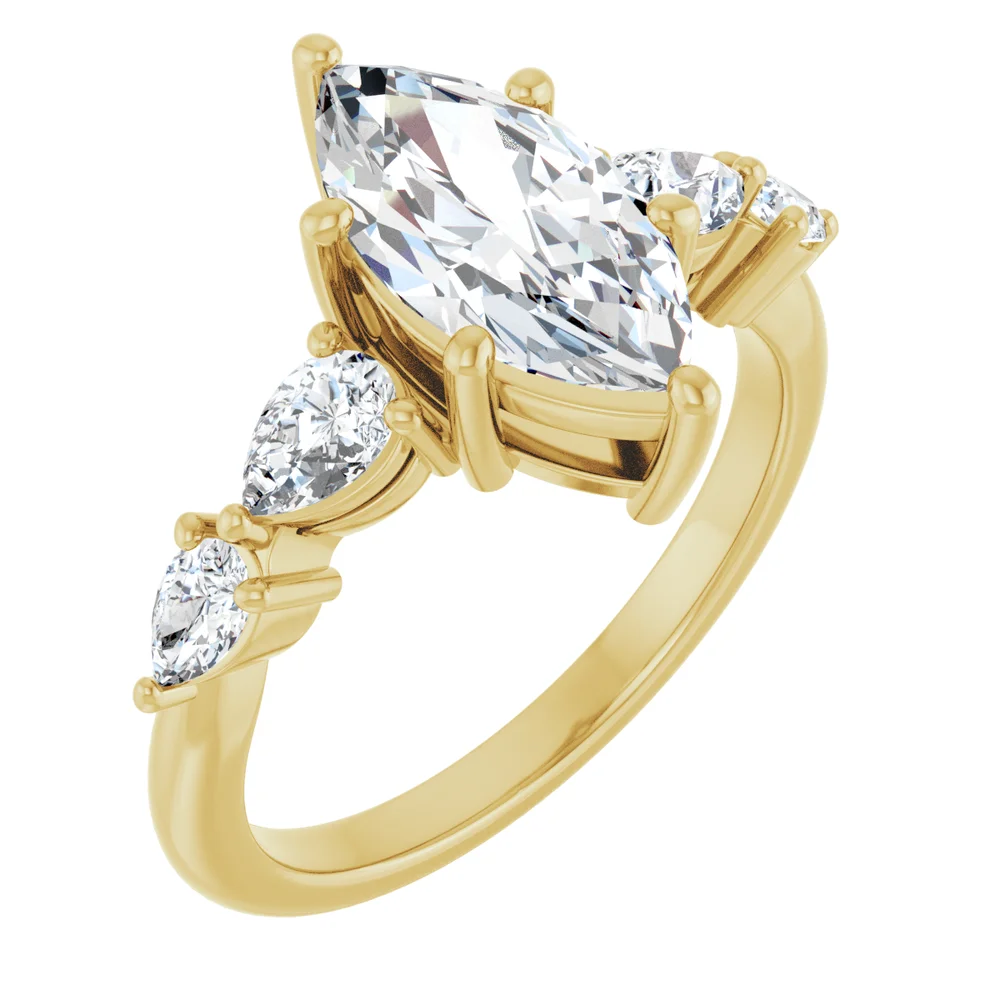 Using pear-shaped diamonds on the sides instead of the more traditional round brilliant stones makes this ring stand out brightly and sparkle greatly. Center stone sold separately. Pricing for customized pieces is variable depending on each person’s design. Please contact us at the store for more information.