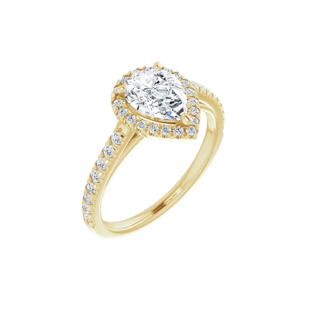 This modern classic features beautiful French-set diamonds in a halo design and on the band. Center stone sold separately. Pricing for customized pieces is variable depending on each person’s design. Please contact us at the store for more information.