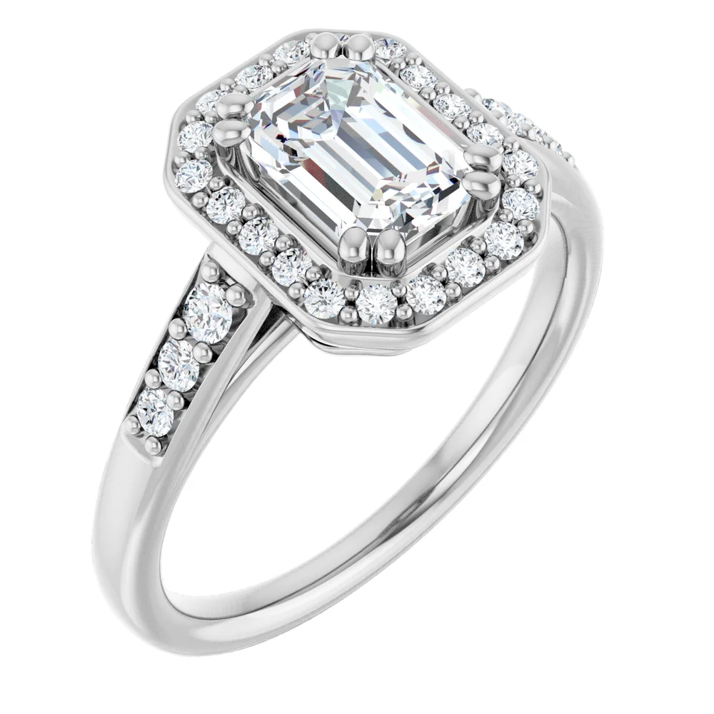 This classic look will always be in style, with a stunning halo wrapping around the center stone and accent diamonds cascading down the band in a single row. Center stone sold separately. Pricing for customized pieces is variable depending on each person’s design. Please contact us at the store for more information.