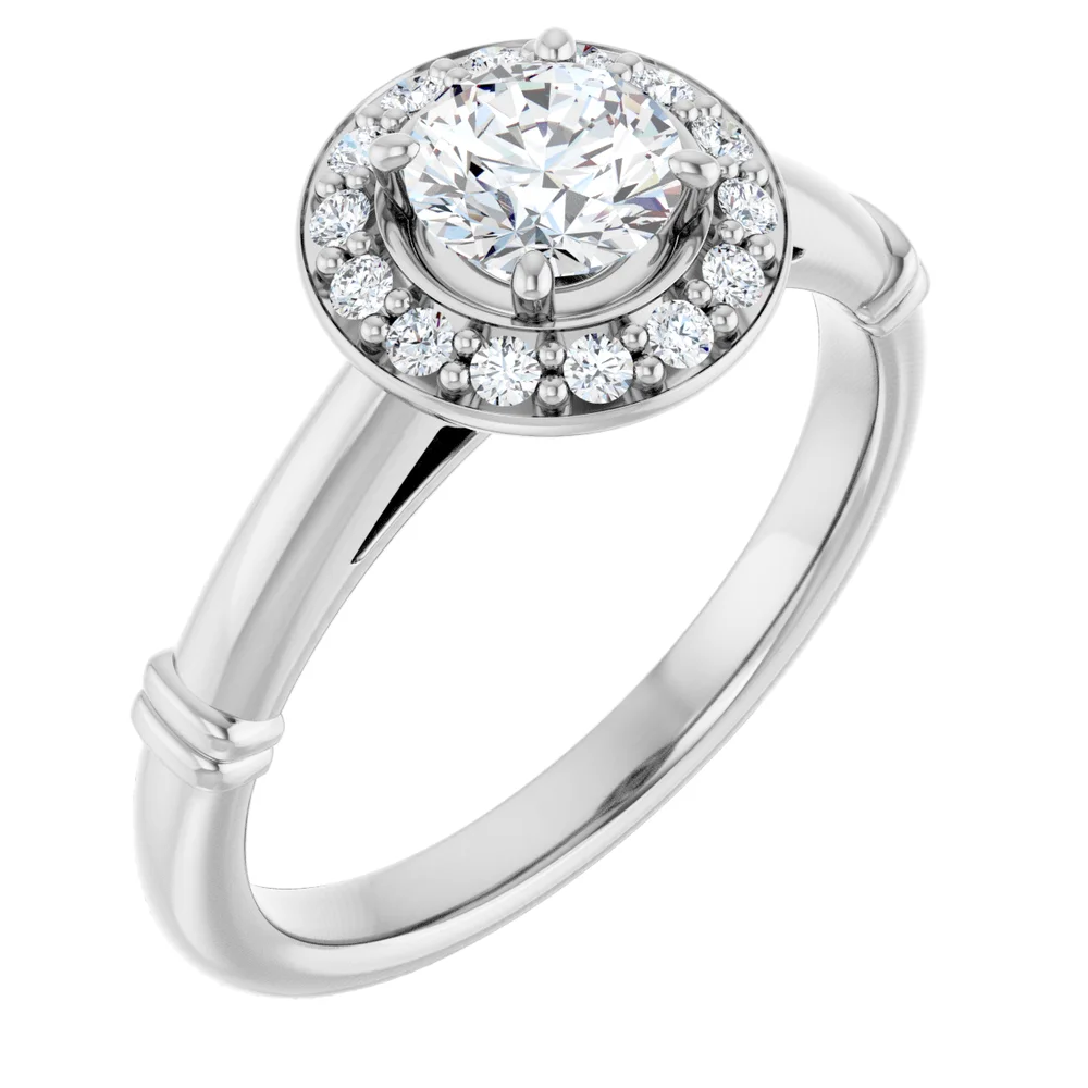 The little details on this ring make it stand out, with a ring of gold around the perfectly formed halo and the two ridges of gold further down on the shoulders. Center stone sold separately. Pricing for customized pieces is variable depending on each person’s design. Please contact us at the store for more information.