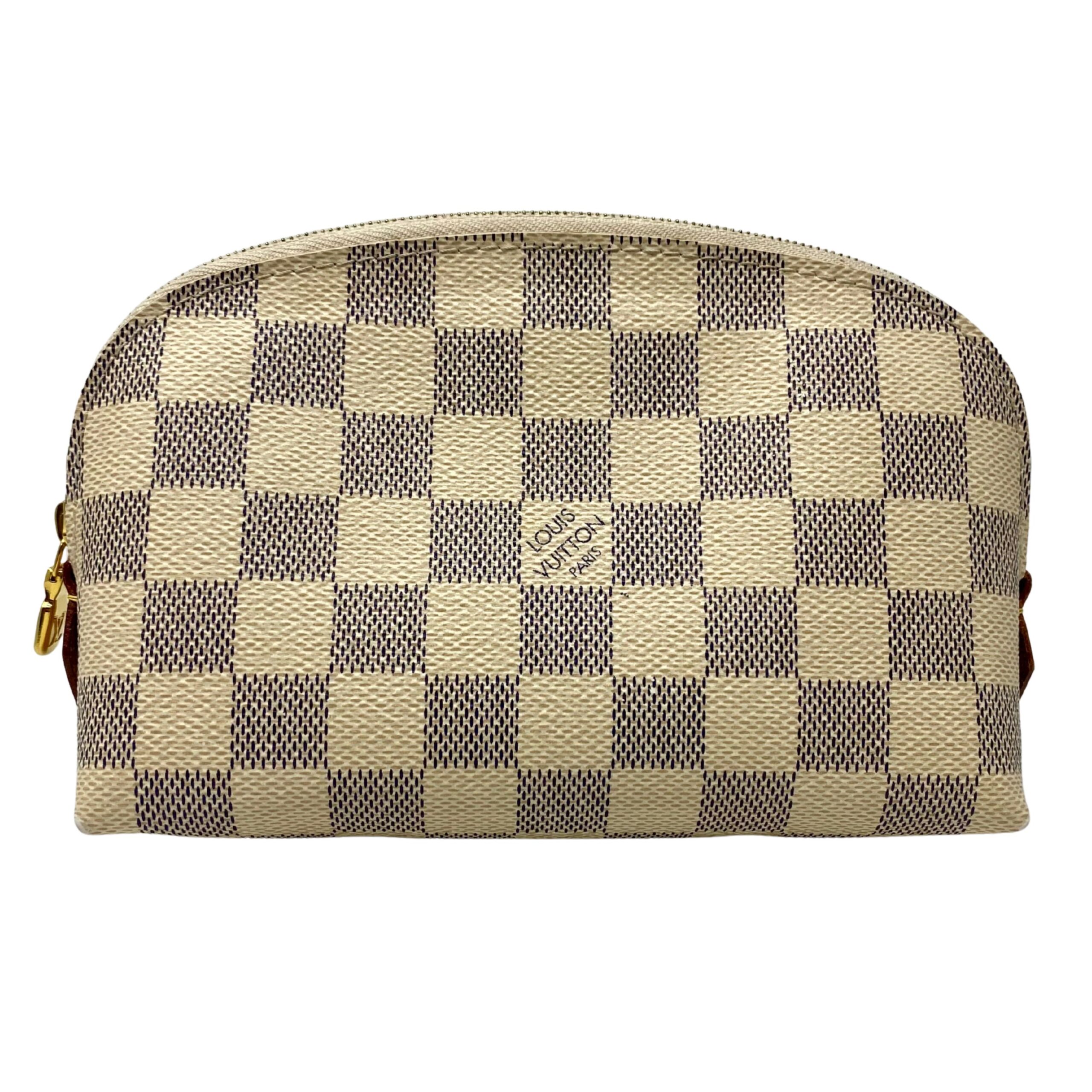 Blue and pink Louis Vuitton Damier Azur Pochette Cosmetic Pouch with zipper close on top, one slip pocket on the inside.