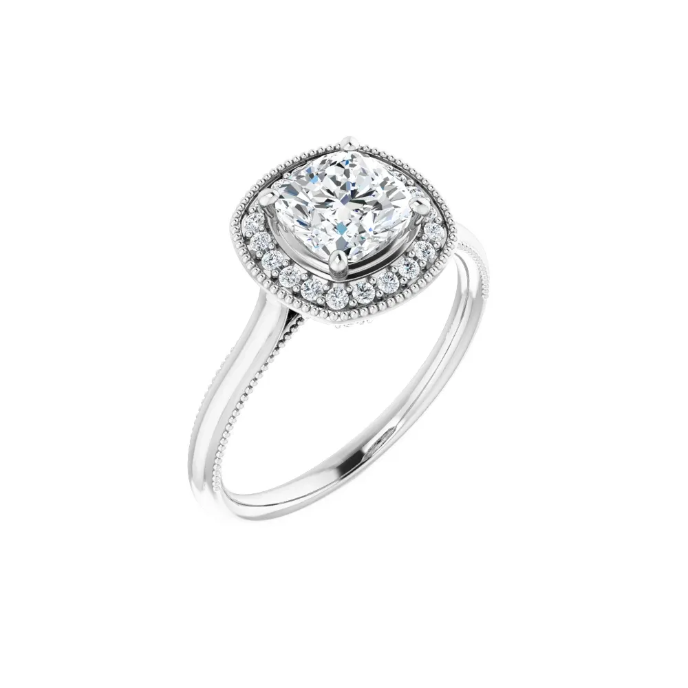 This ring combines the vintage and the modern, with a detailing pattern that accents stunning diamonds set in the fancy head beneath the center stone. Center stone sold separately. Pricing for customized pieces is variable depending on each person’s design. Please contact us at the store for more information.