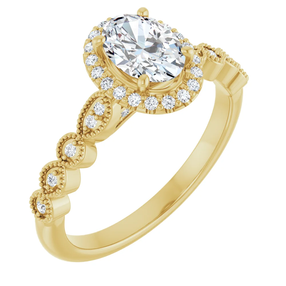 This modern design uses twisting milgrain detailing to draw the eye, playing with shapes in the band and crowning the look with a stunning halo. Center stone sold separately. Pricing for customized pieces is variable depending on each person’s design. Please contact us at the store for more information.
