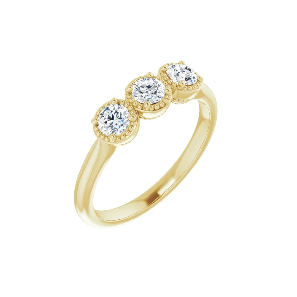 Delicate milgrain detailing adds artistic flair to this timeless past, present, future design. Center stone sold separately. Pricing for customized pieces is variable depending on each person’s design. Please contact us at the store for more information.