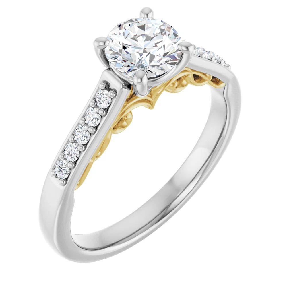 The timeless elegance of this engagement ring is enhanced by the modern twist in the decorative undercarriage, highlighting the attention to detail in the design of this beautiful piece. Center stone sold separately. Pricing for customized pieces is variable depending on each person’s design. Please contact us at the store for more information.