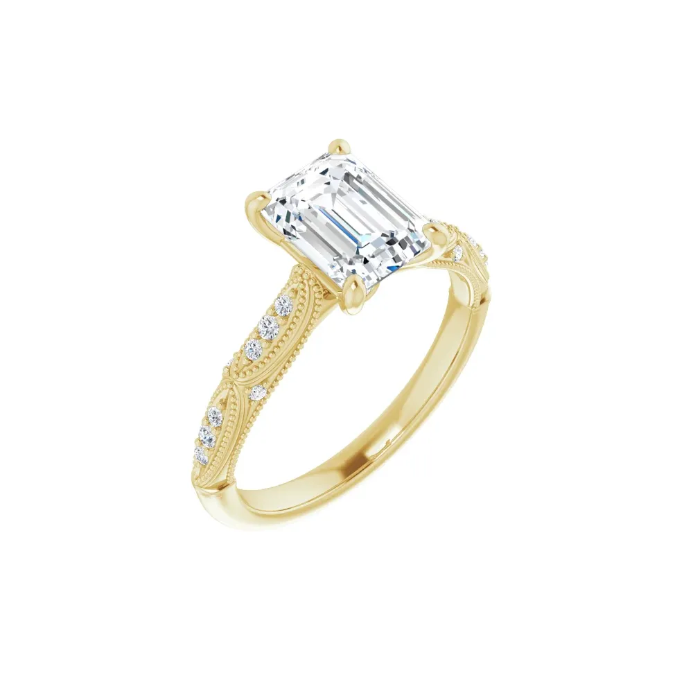 The fine details in this ring set it apart, using both milgrain patterning in the gold and round brilliant diamonds to create a timeless vintage look that catches the eye. Center stone sold separately. Pricing for customized pieces is variable depending on each person’s design. Please contact us at the store for more information.